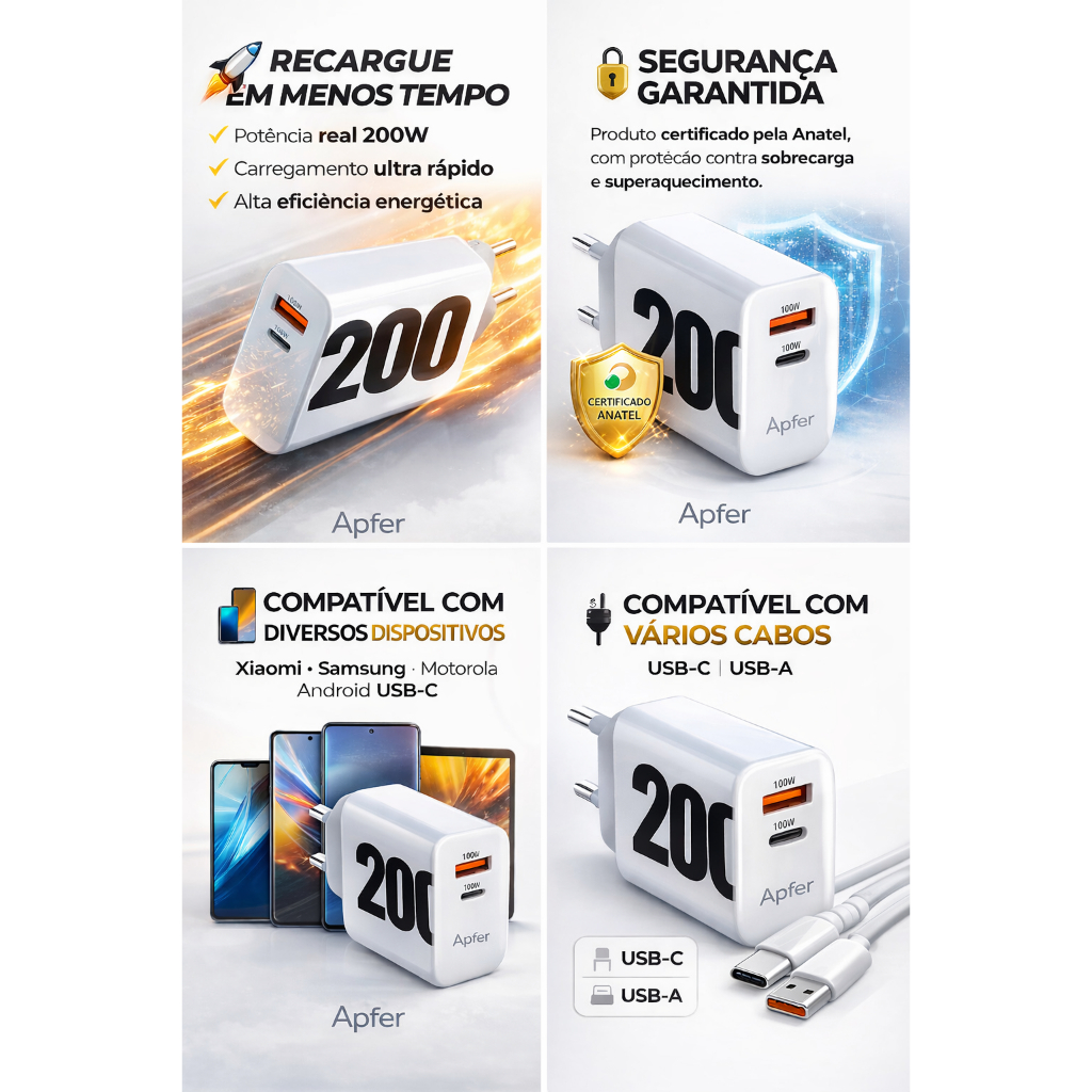 Carregador Turbo 200W USB-C + USB-A QC 3.0 Power Delivery Compatível Xiaomi – Super Rápido