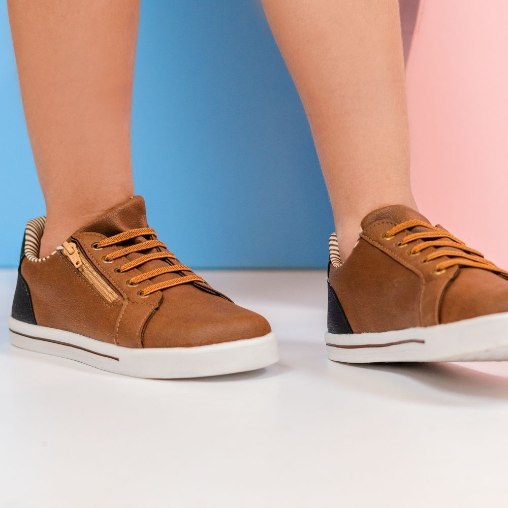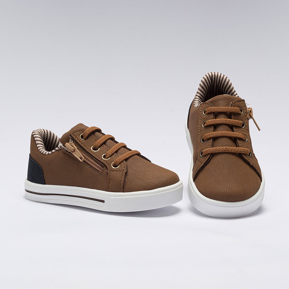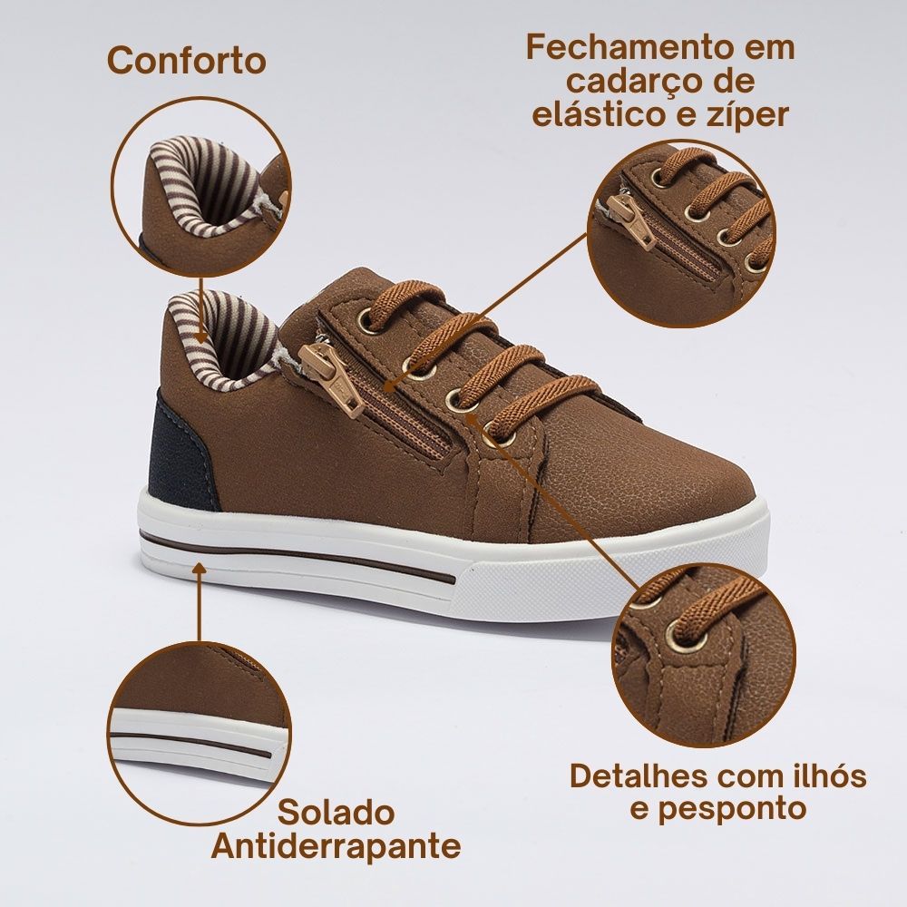 Tênis Infantil Menino Casual Cadarço Elástico Zíper Marrom