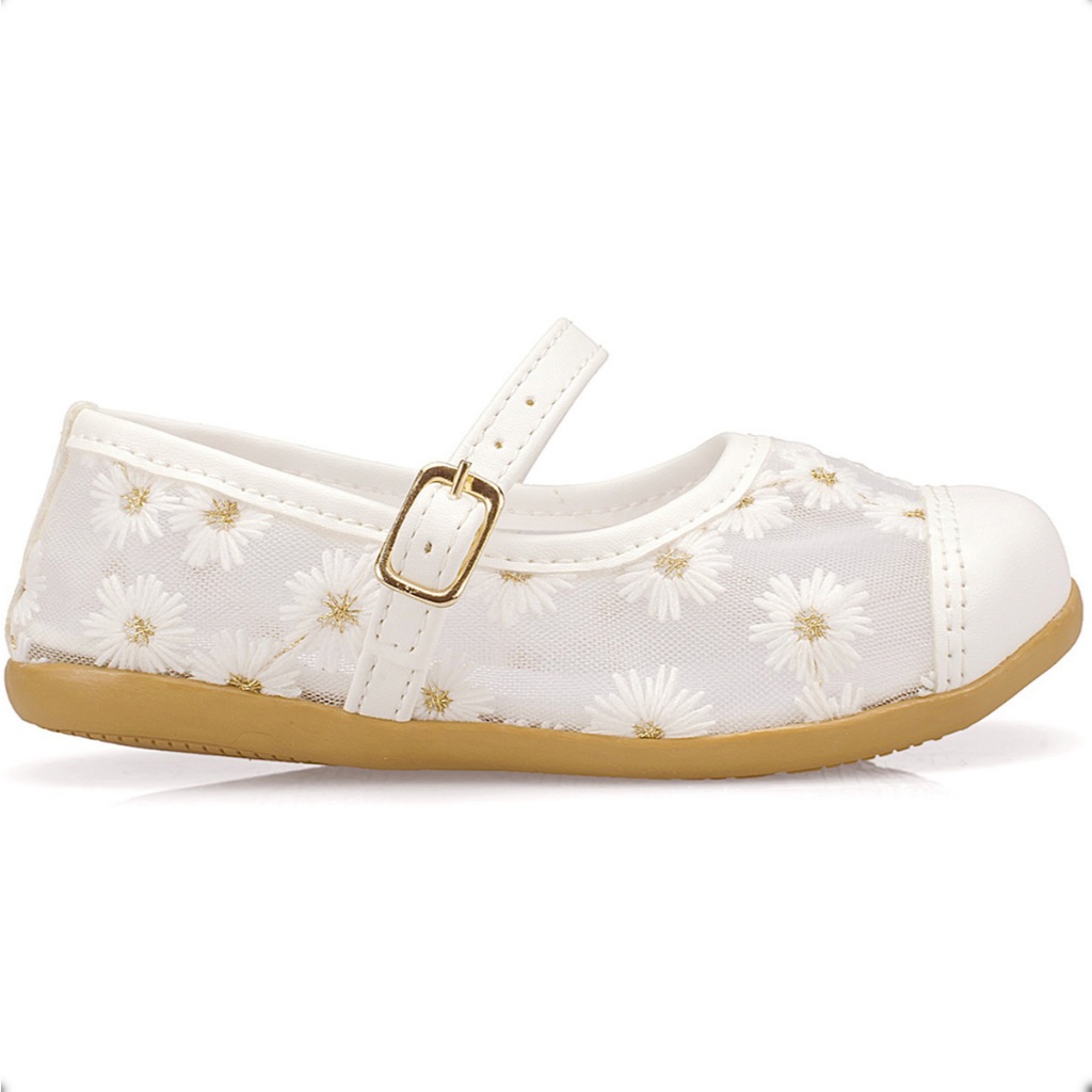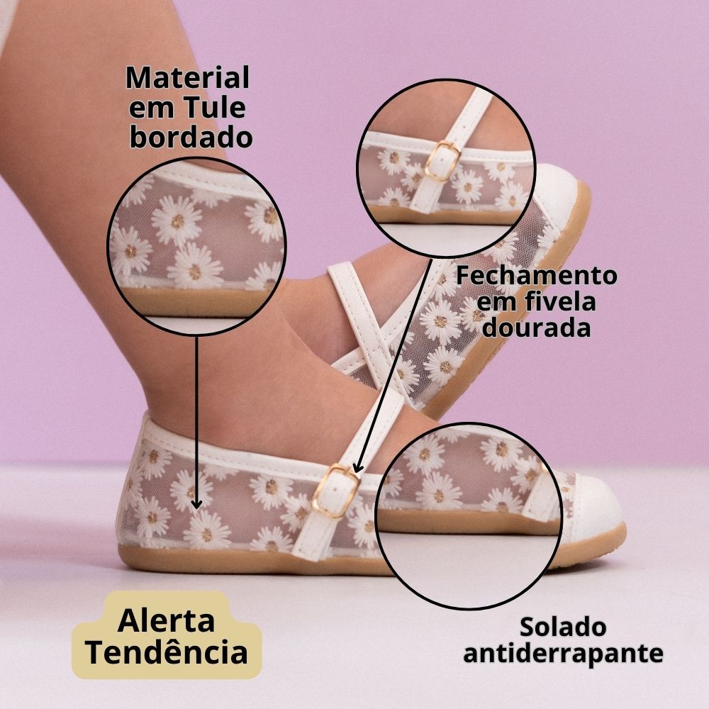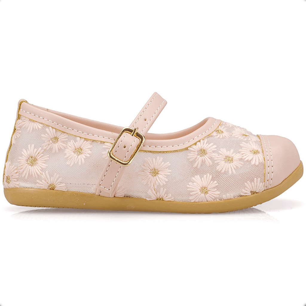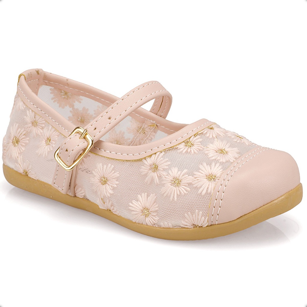 Sapatilha Infantil Menina Encanto Flores Tule Bordadas Confortável Delicada Floral Rosa Festas