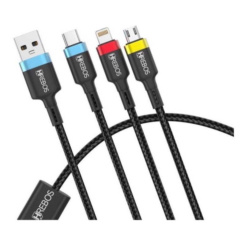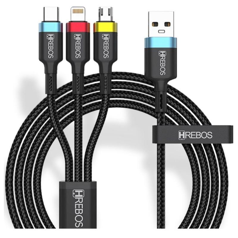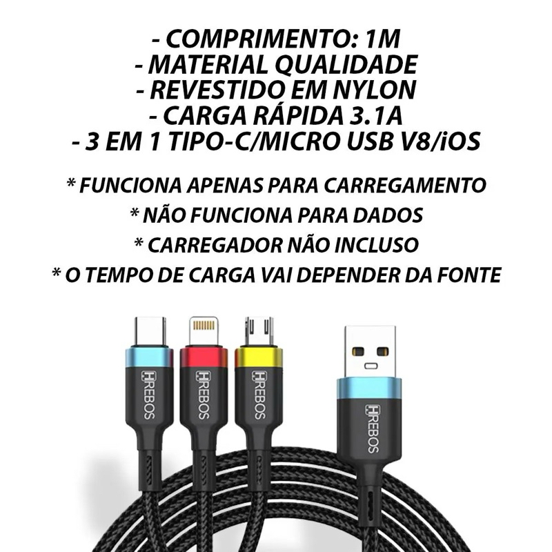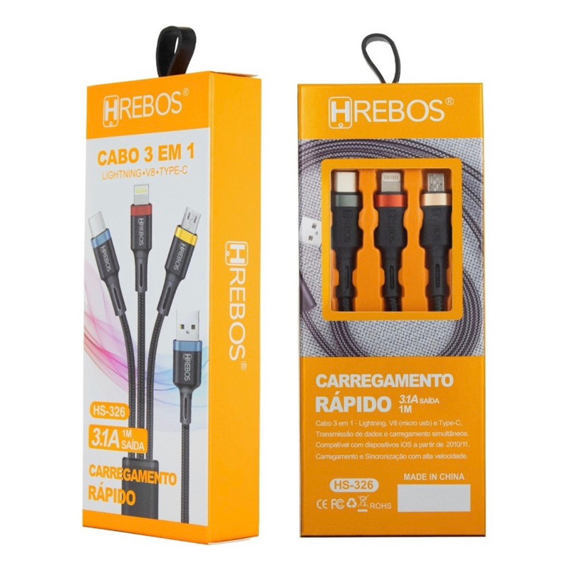 Cabo Carregador Usb Turbo 3 Em 1 Tipo C Lightning E Usb V8 Cor Preto Hs-326 Novidade Lançamento 2024(em até 12 horas)