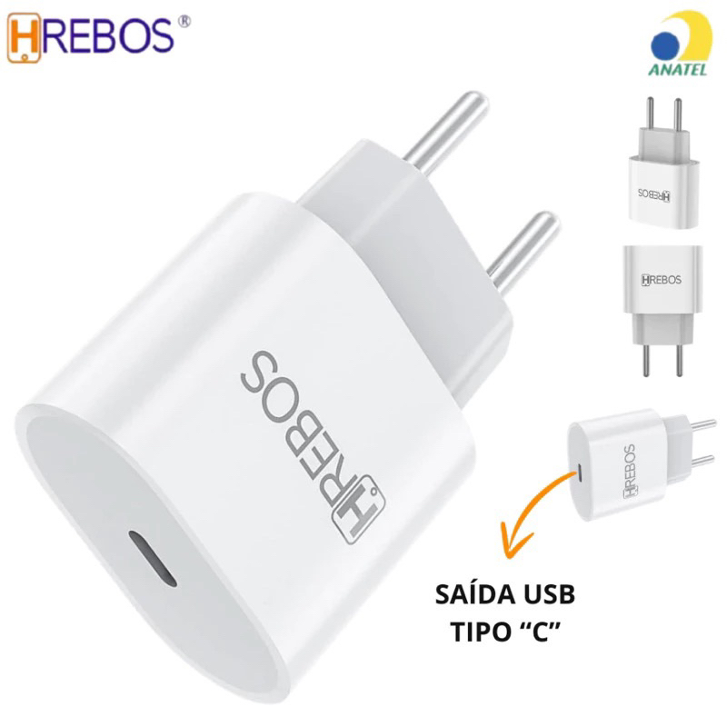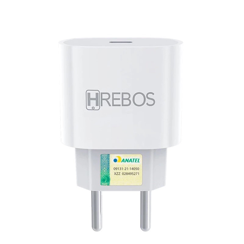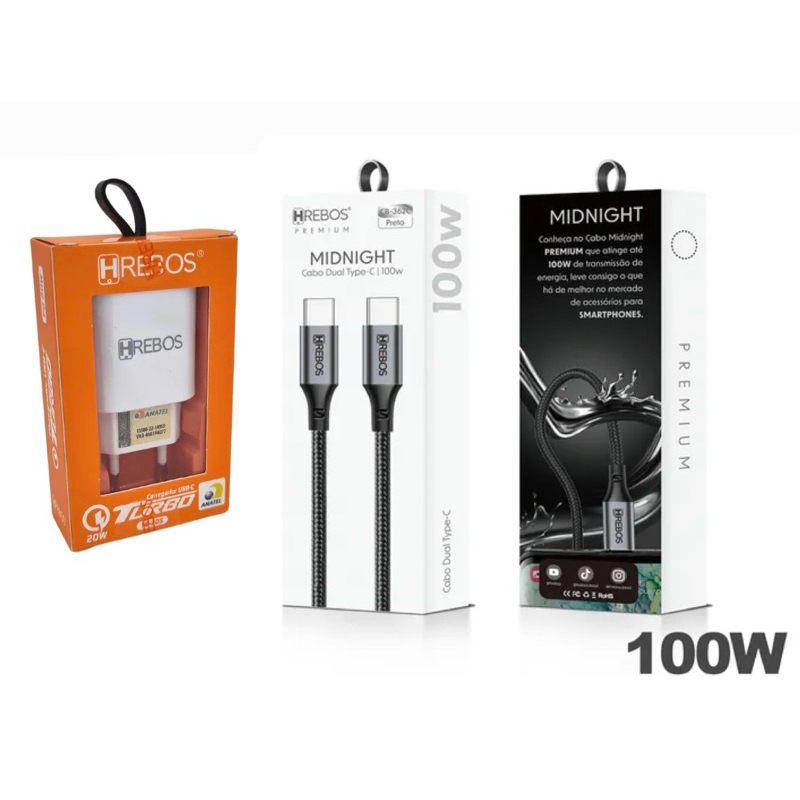 Hrebos Fonte Turbo Power PD 20W HS-363 USB-C Carregador Anatel p/ iPhone 14/15 Pro Max Envio Rápido com Cabo Midnight 1m