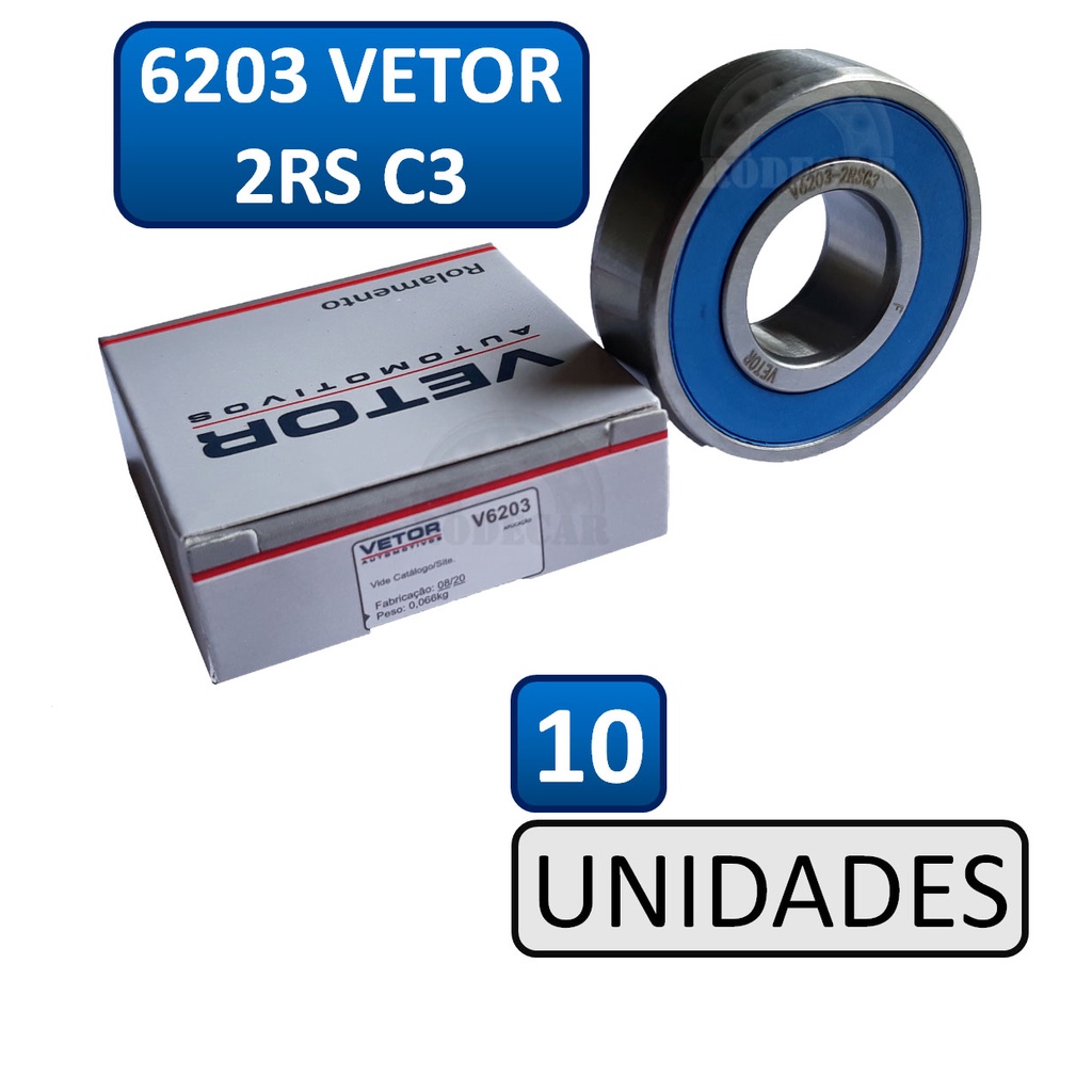 KIT com 10 rolamentos 6203 VETOR (VTO) 2RS C3 - 17mm x 40mm x 12mm