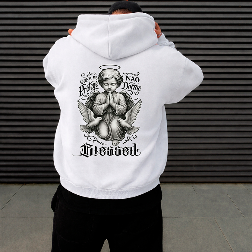Moletom Canguru Streetwear Urbans Anjo 07 BLESSED Unissex Masculino e Feminino Flanelado Blusa de Frio Estampado
