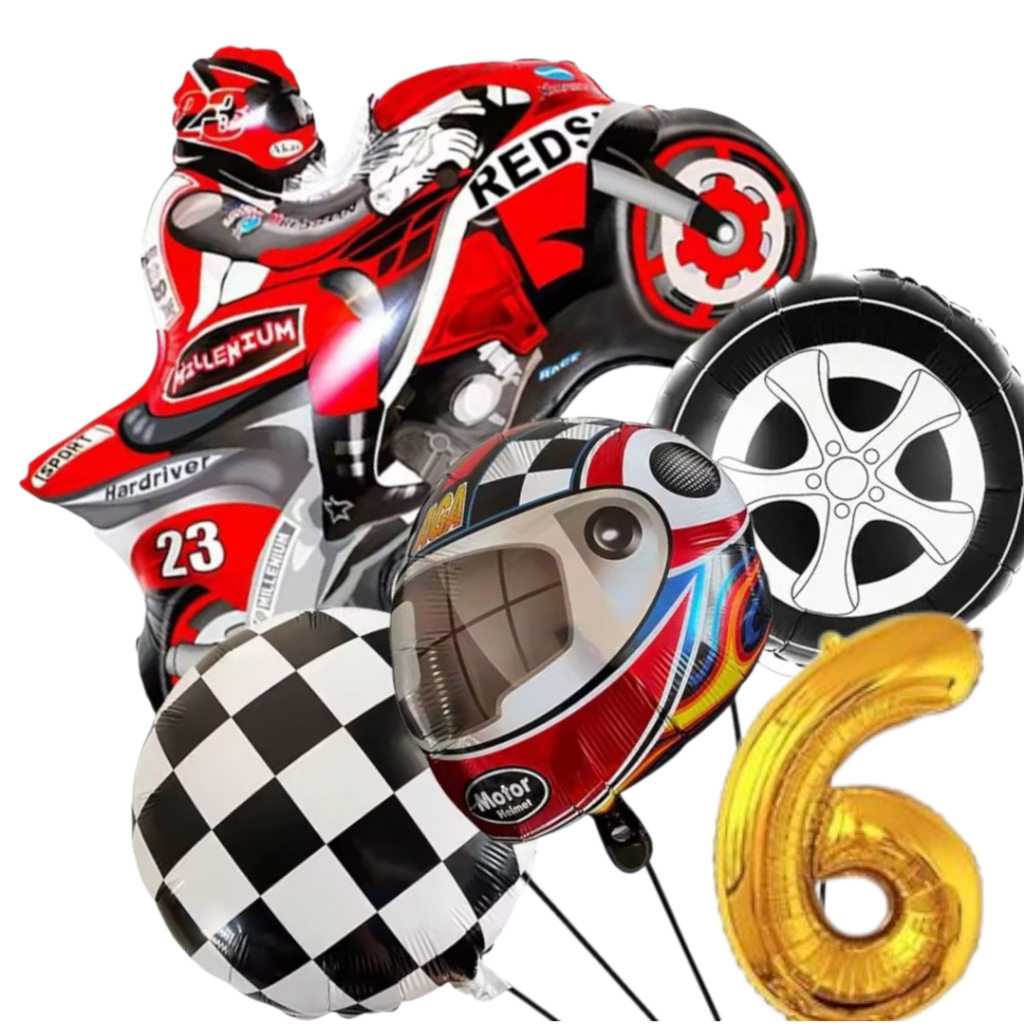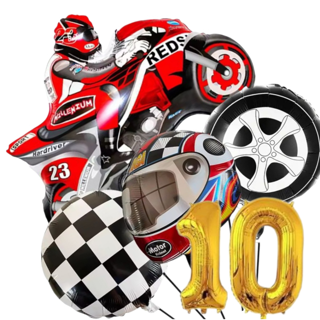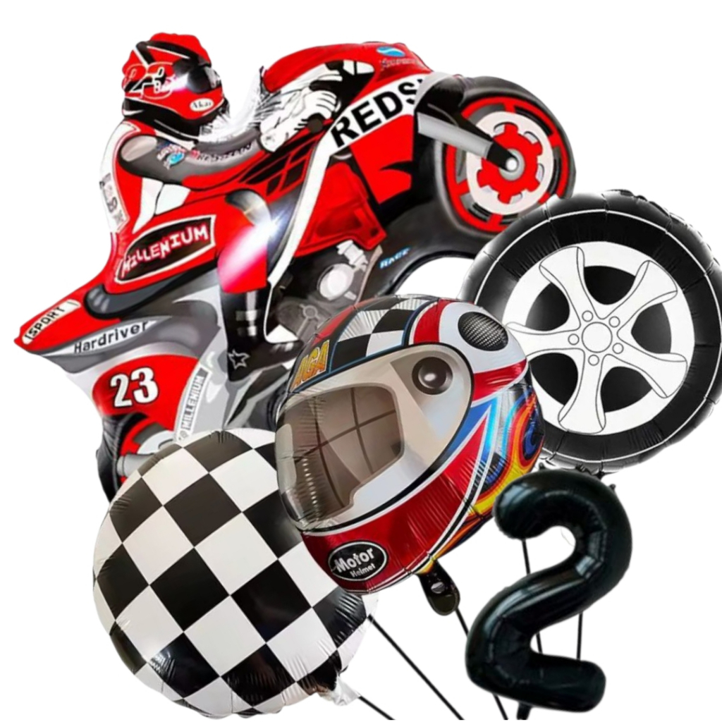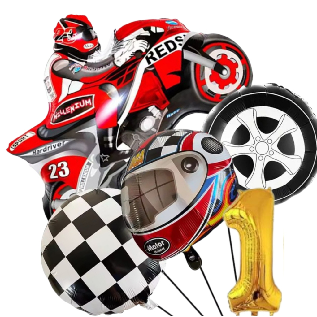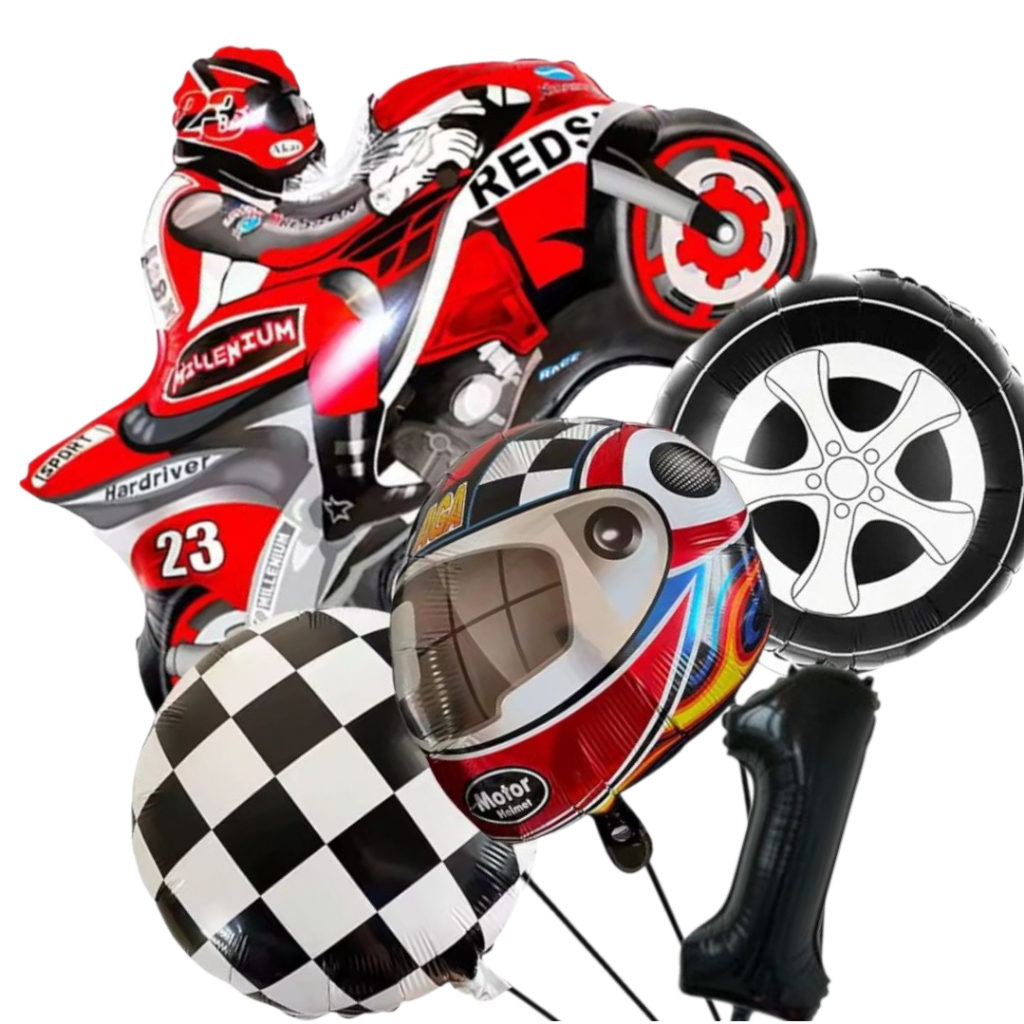KIT CORRIDA MOTO CAPACETE RODA BANDEIRA QUADRICULADA NÚMERO BALÃO METALIZADO RACING CARRO LARGADA FÓRMULA 1 MOTOVELOCIDA