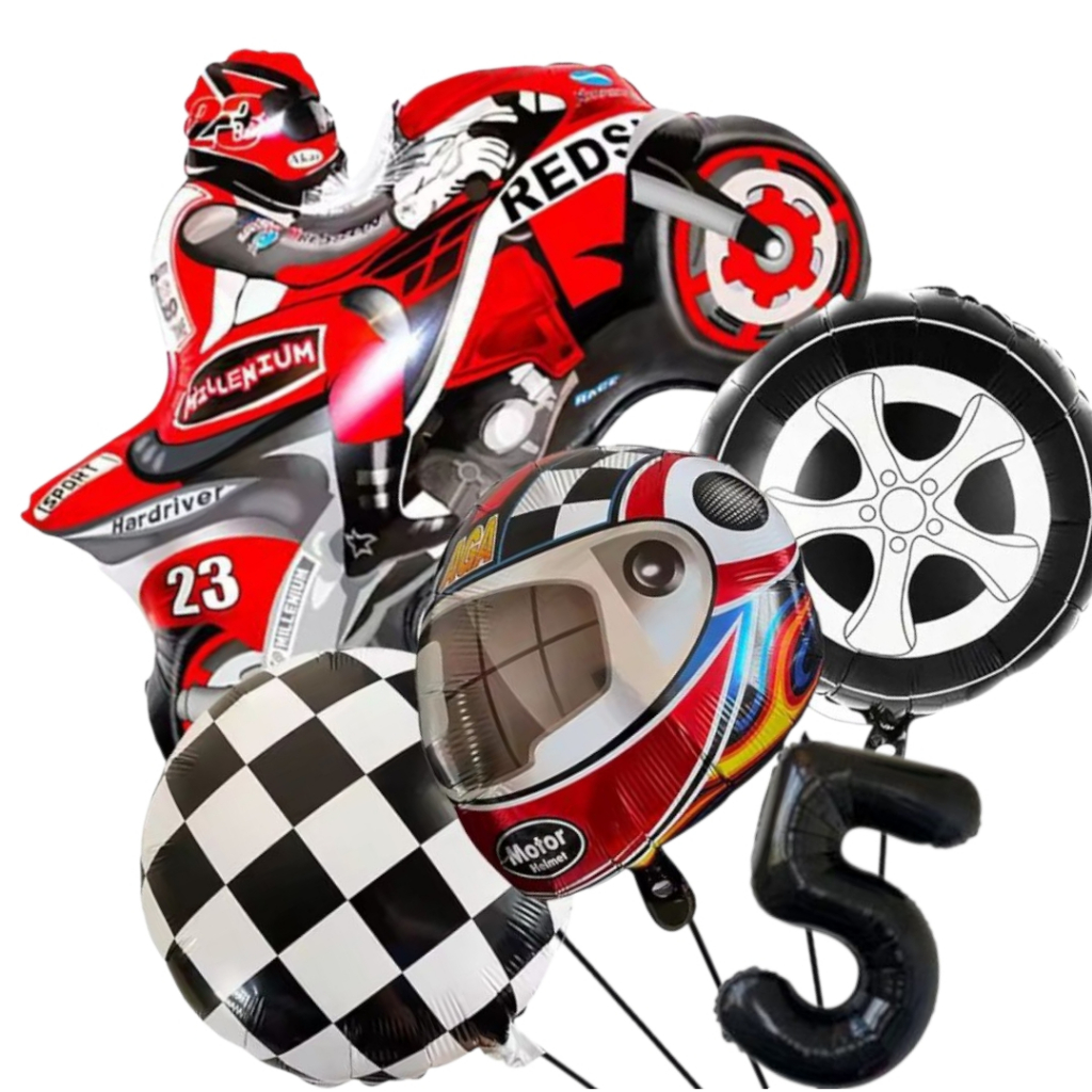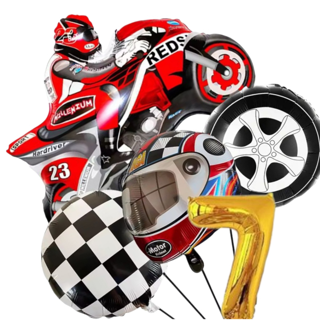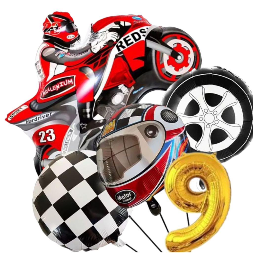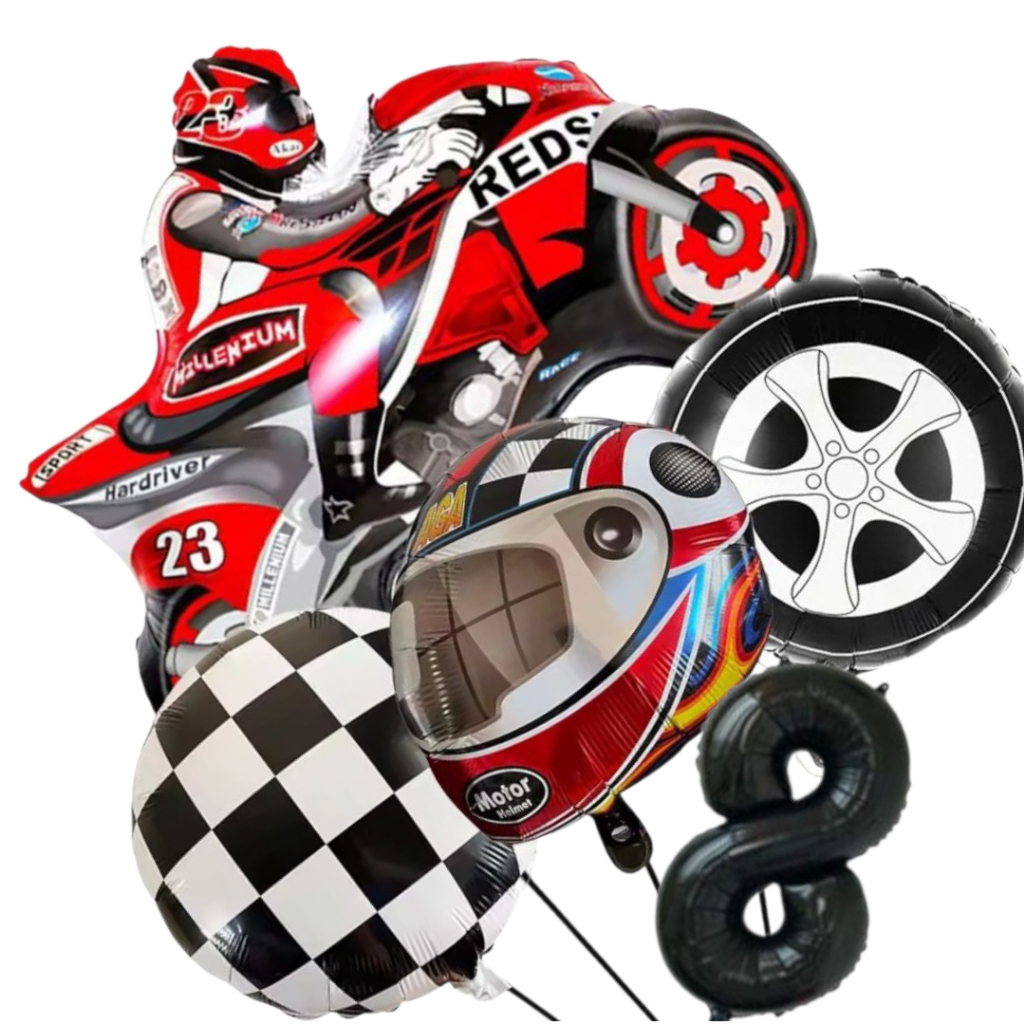 KIT CORRIDA MOTO CAPACETE RODA BANDEIRA QUADRICULADA NÚMERO BALÃO METALIZADO RACING CARRO LARGADA FÓRMULA 1 MOTOVELOCIDA