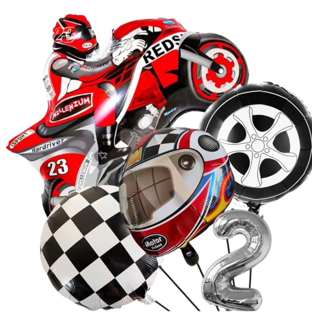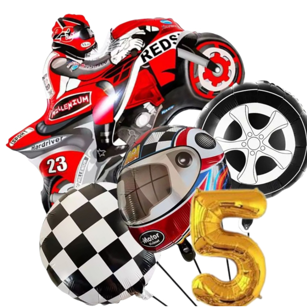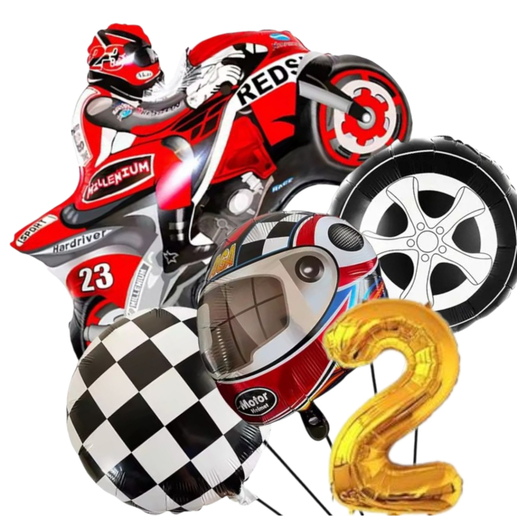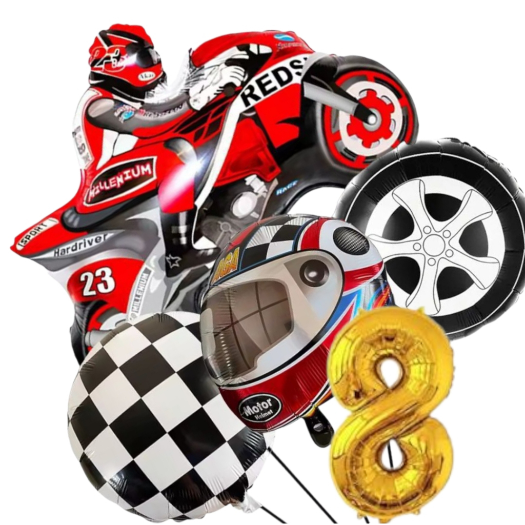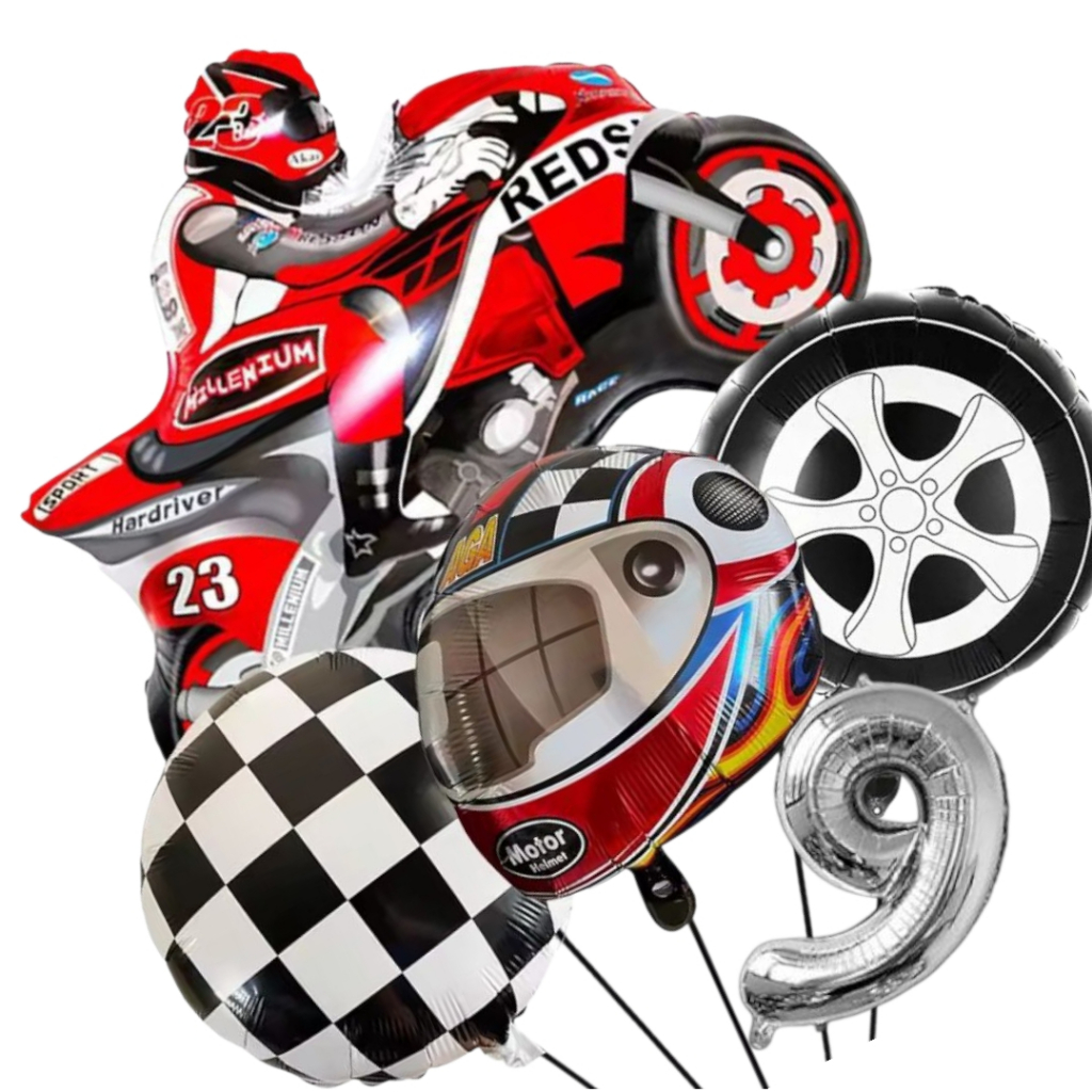 KIT CORRIDA MOTO CAPACETE RODA BANDEIRA QUADRICULADA NÚMERO BALÃO METALIZADO RACING CARRO LARGADA FÓRMULA 1 MOTOVELOCIDA