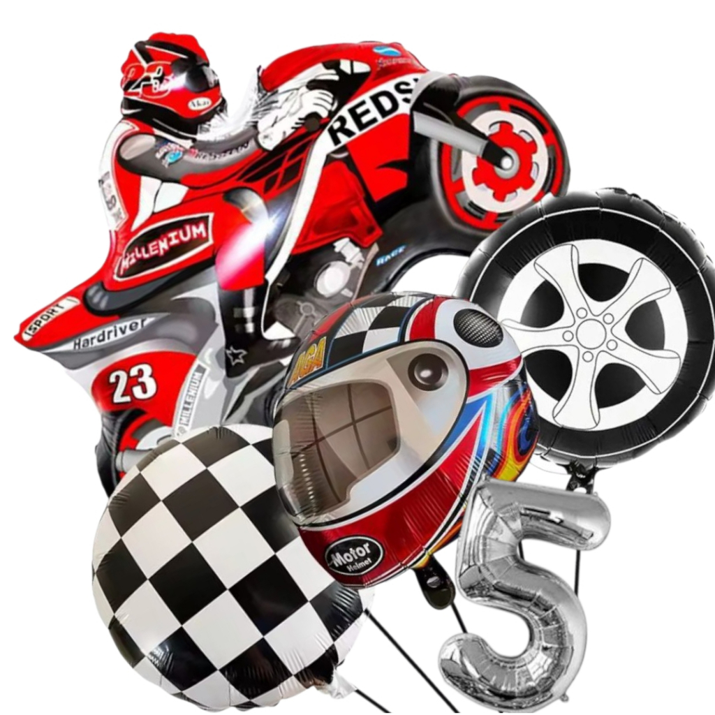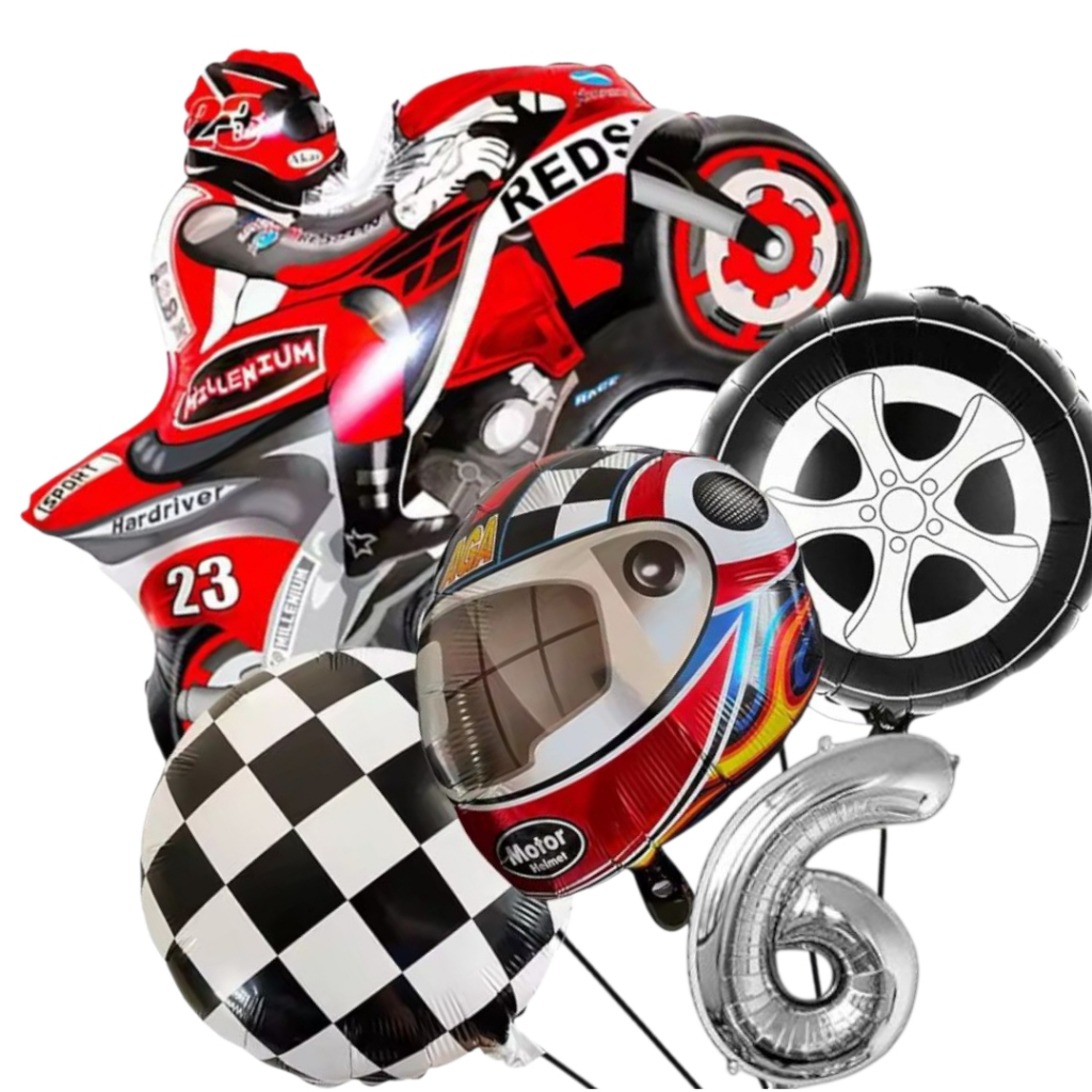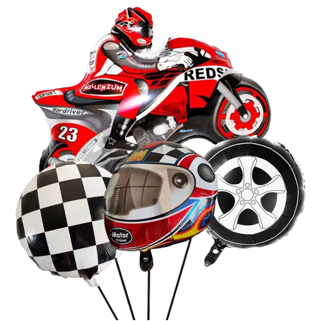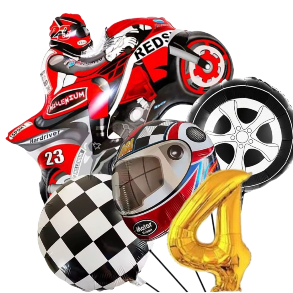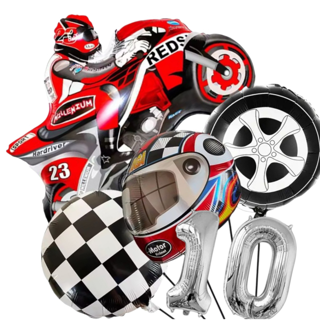 KIT CORRIDA MOTO CAPACETE RODA BANDEIRA QUADRICULADA NÚMERO BALÃO METALIZADO RACING CARRO LARGADA FÓRMULA 1 MOTOVELOCIDA