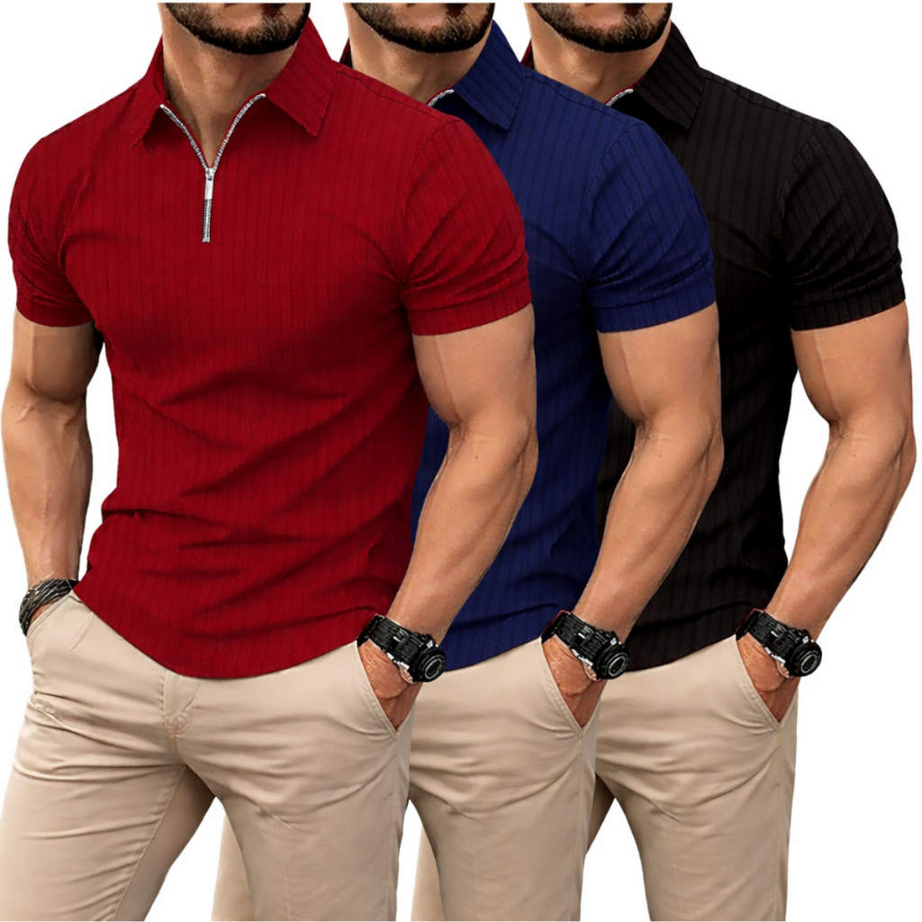 Kit 3 camisas Camiseta Polo Manga Curta Com Ziper Masculina Malha Canelada