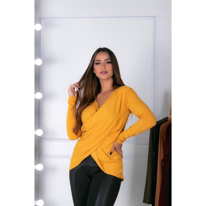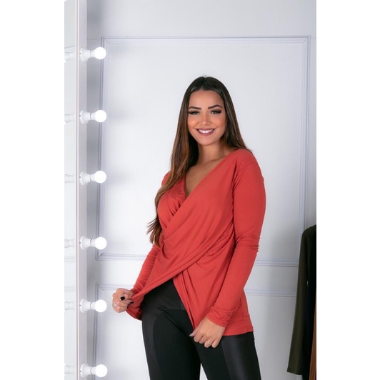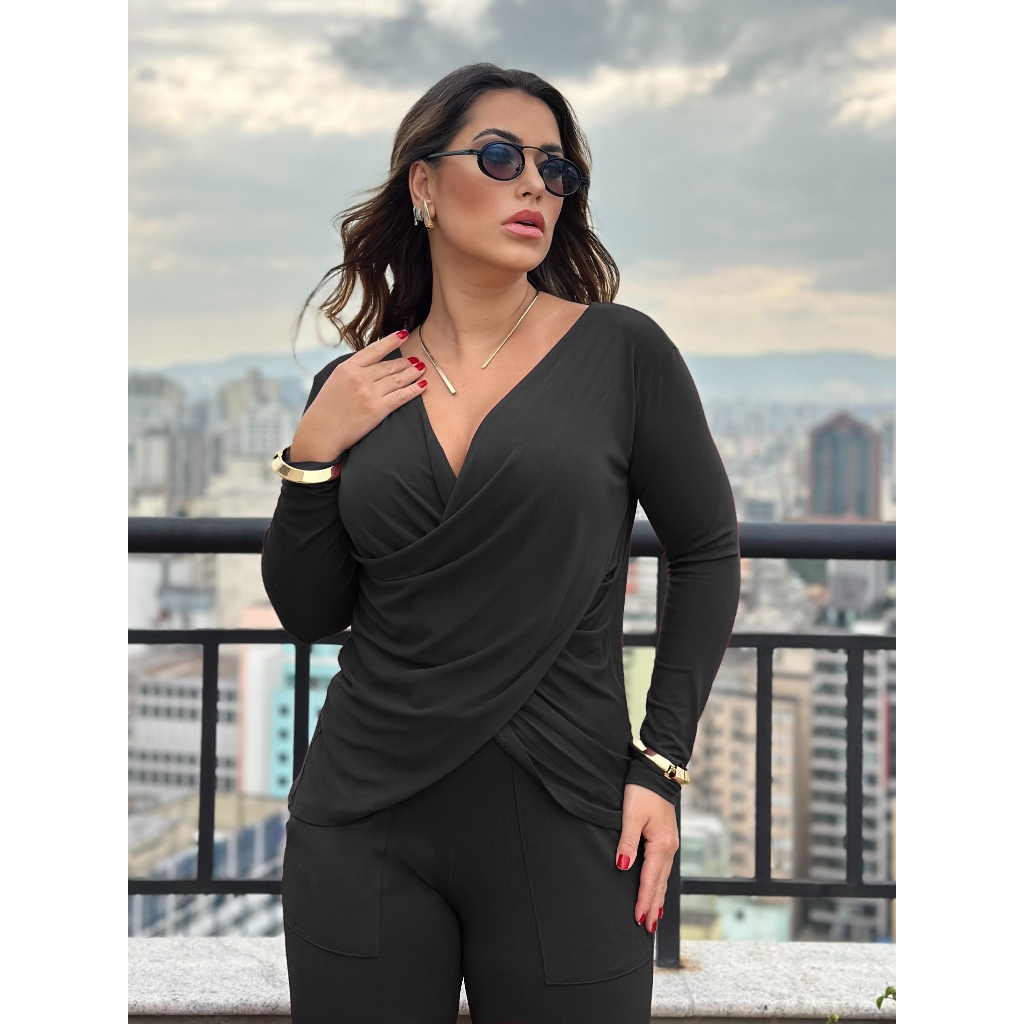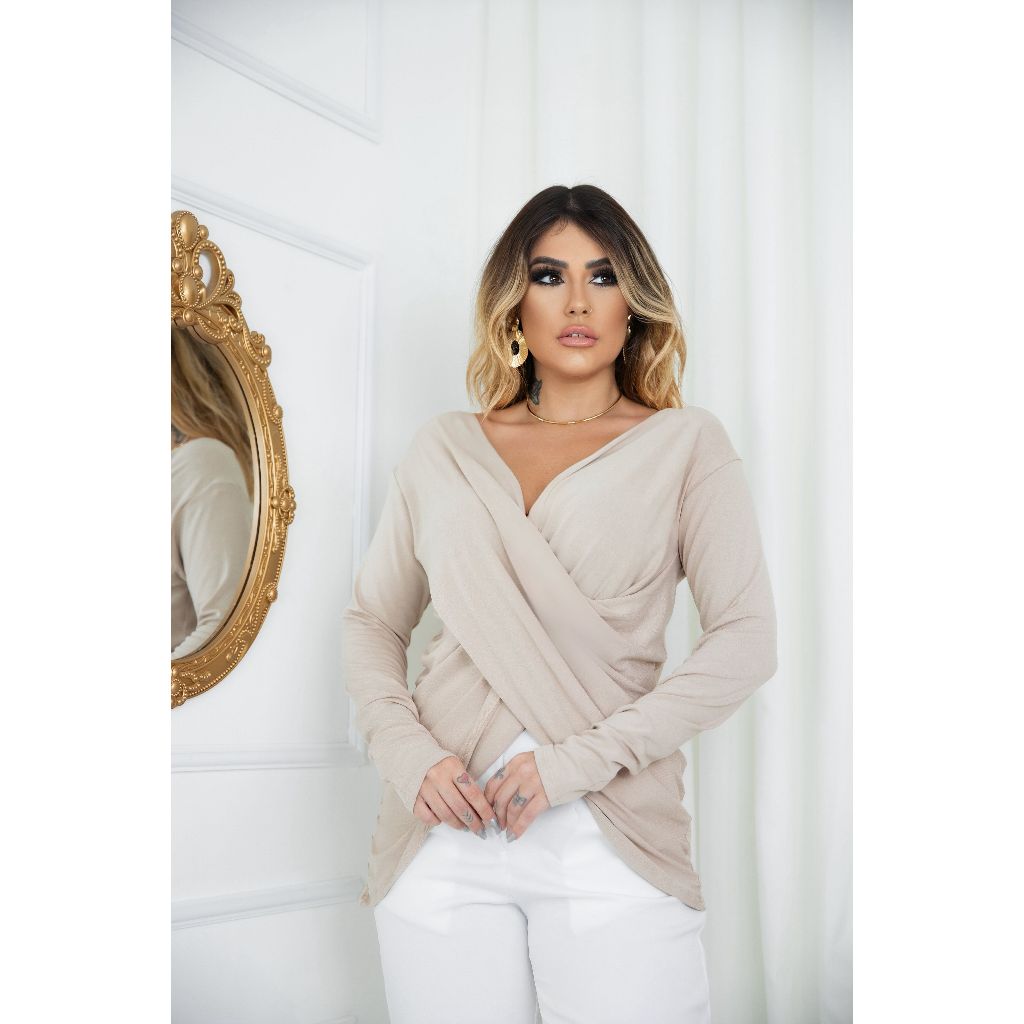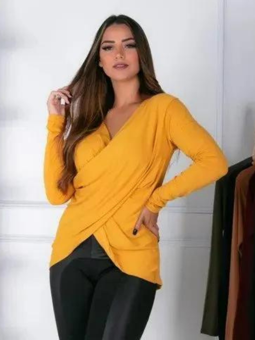 Blusa Feminina Transpassada X Manga Longa Fashion Inverno Malha Dia a Dia Estilosa Elegante Soltinha