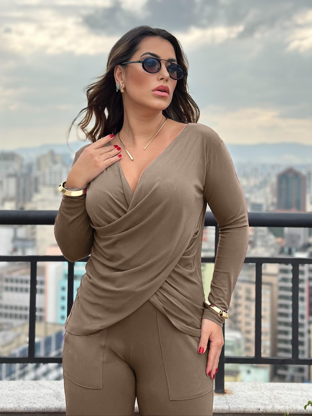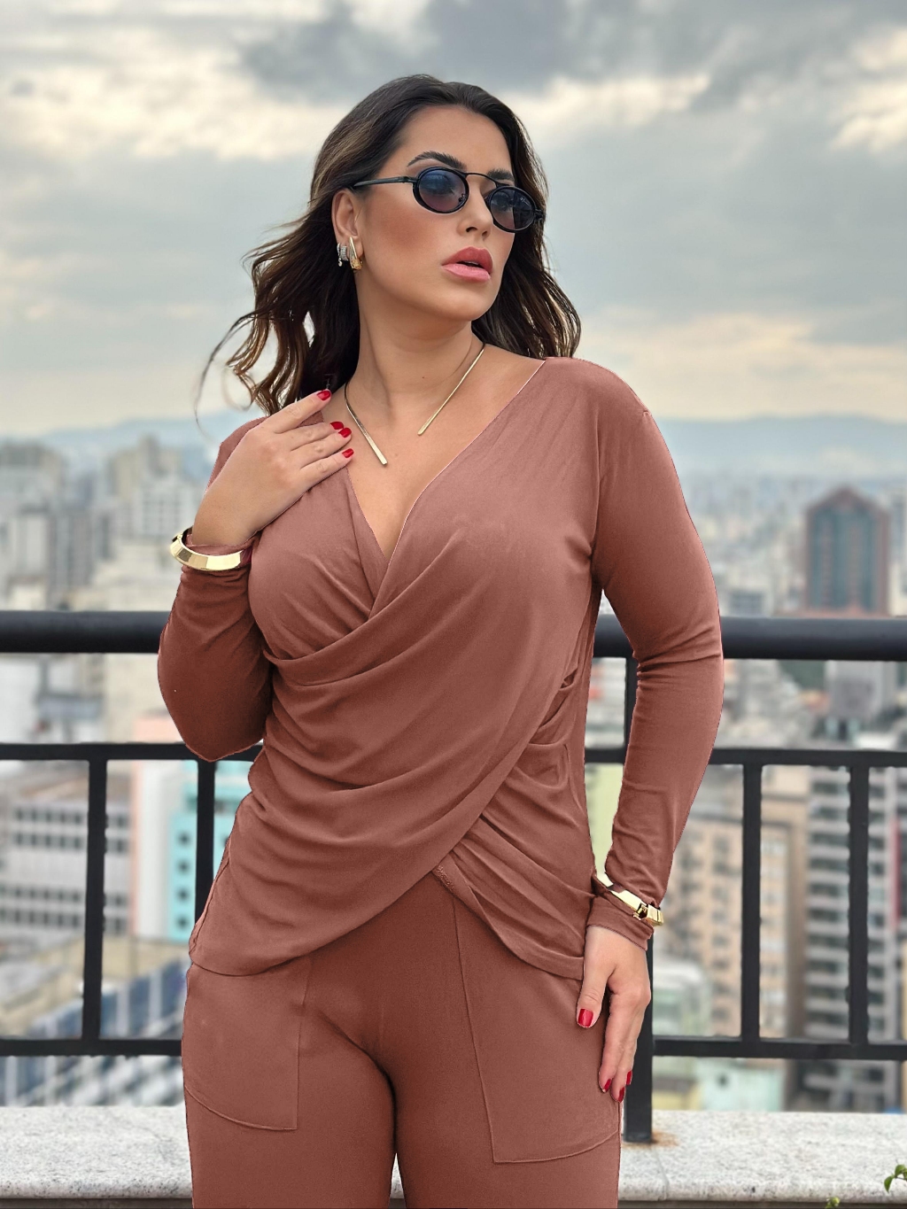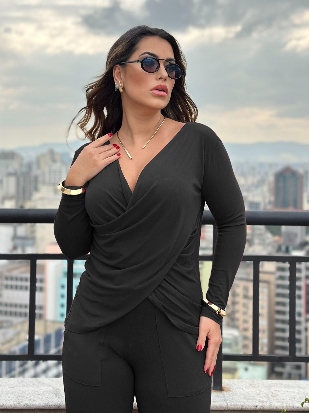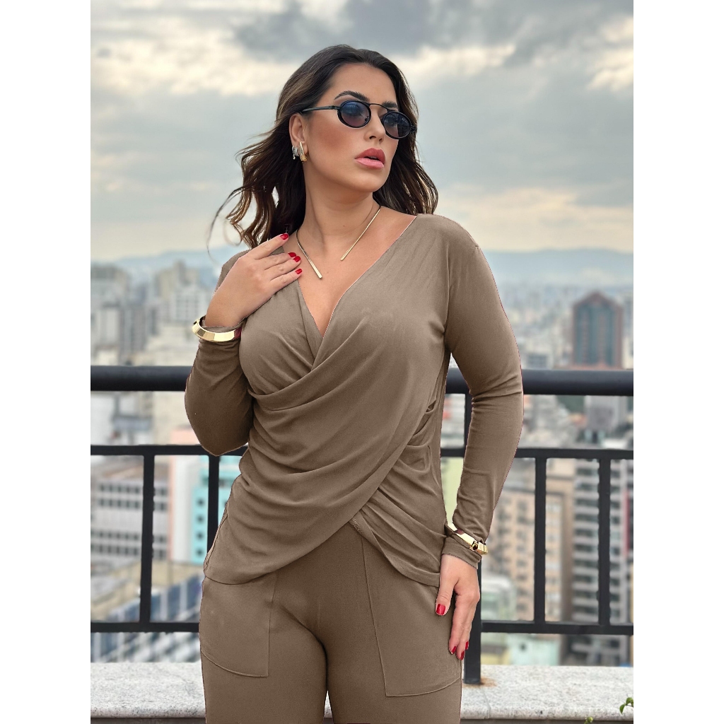 Blusa Feminina Transpassada X Manga Longa Fashion Inverno Malha Dia a Dia Estilosa Elegante Soltinha