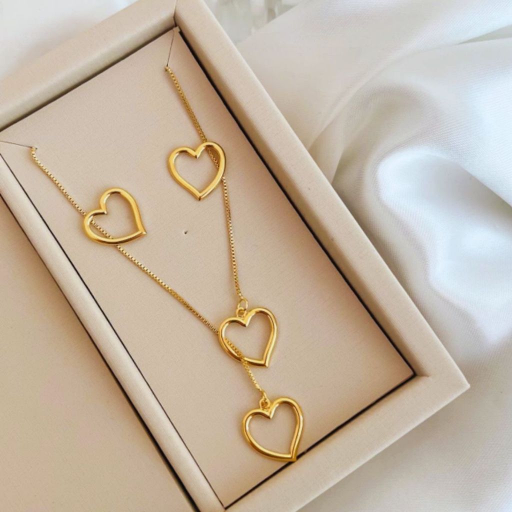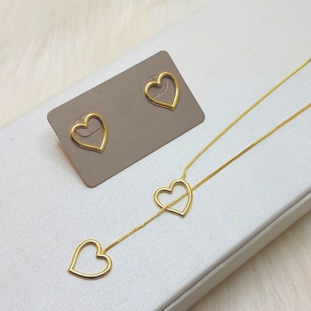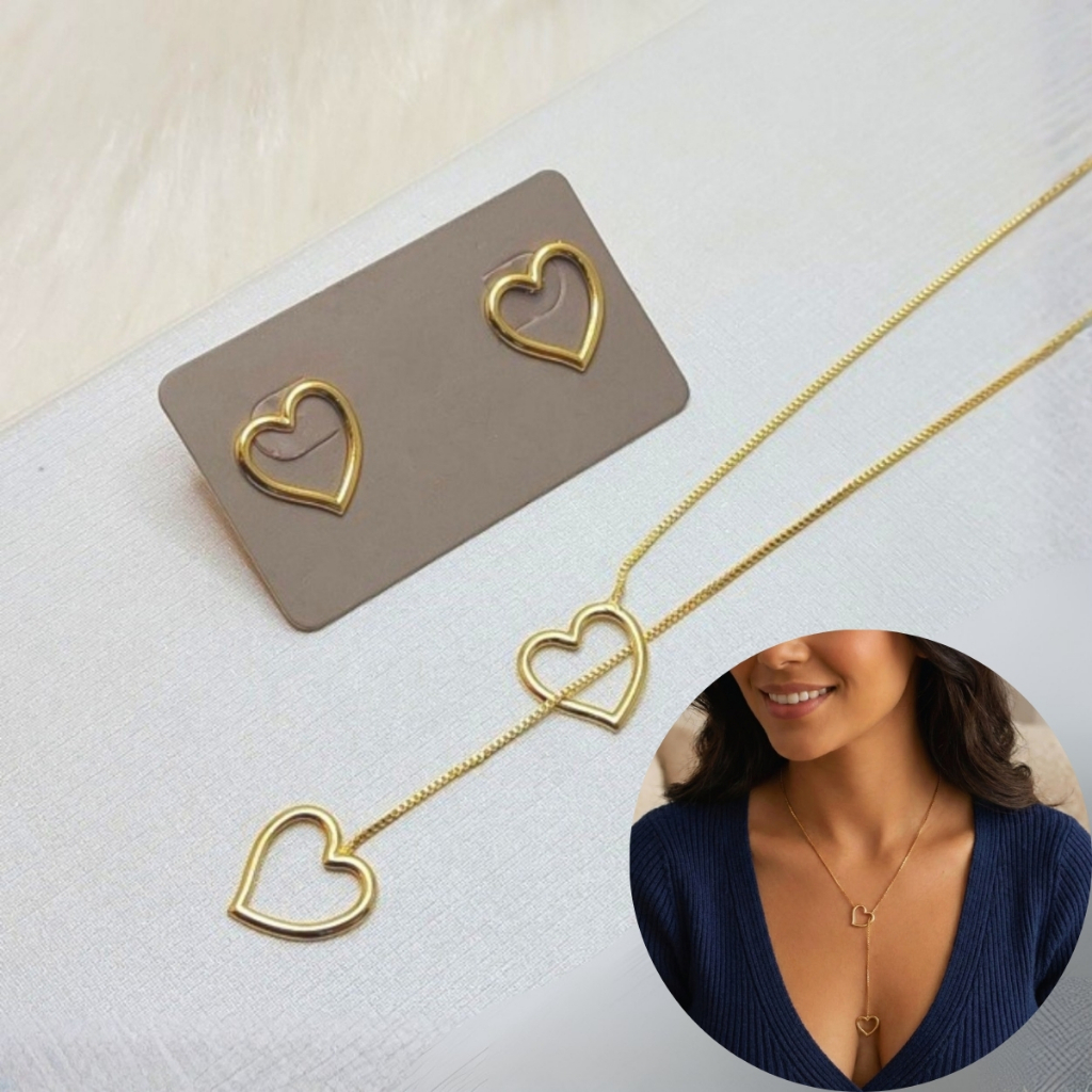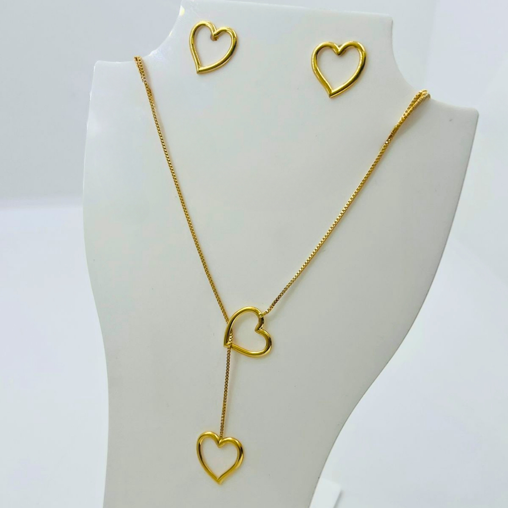 Conjunto brinco e colar moda tendência semijoia gravatinha banhado a ouro