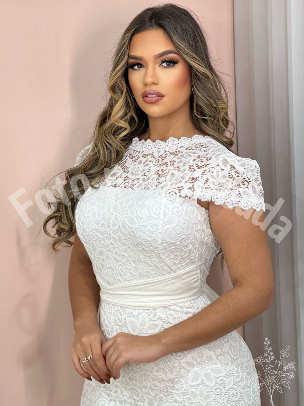 Vestido Branco De Noiva Civil De Renda Midi Com Laço E Decote Em V Slim Plus Size Para Casamento/ Noivado/ Pré Wedding