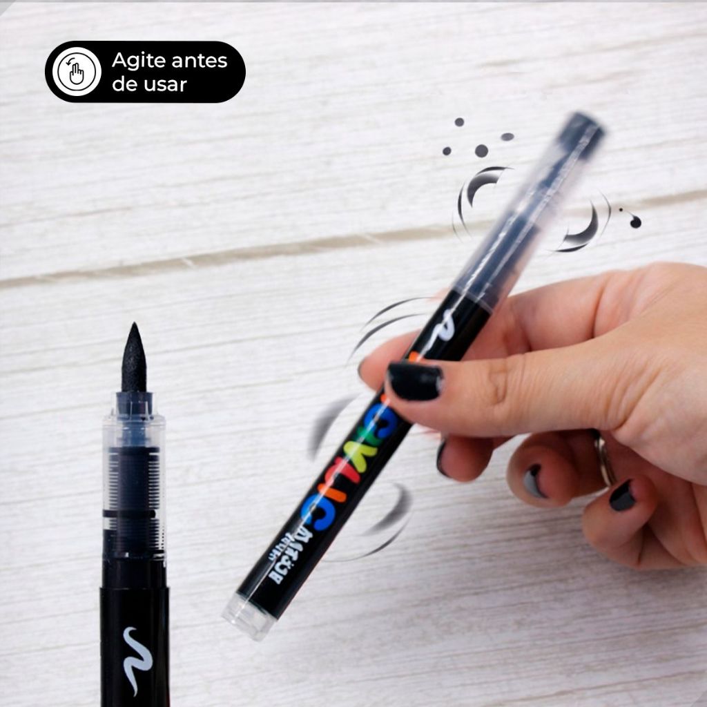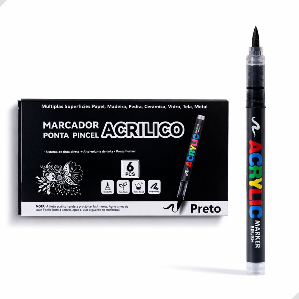 Kit com 6 Canetas Marcador Acrílico Preto Ponta Brush Permanente Para Vidro, Madeira Metal, Plástico