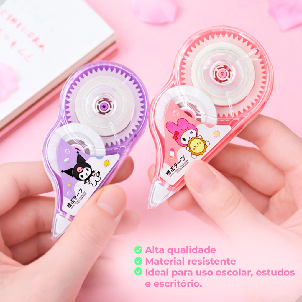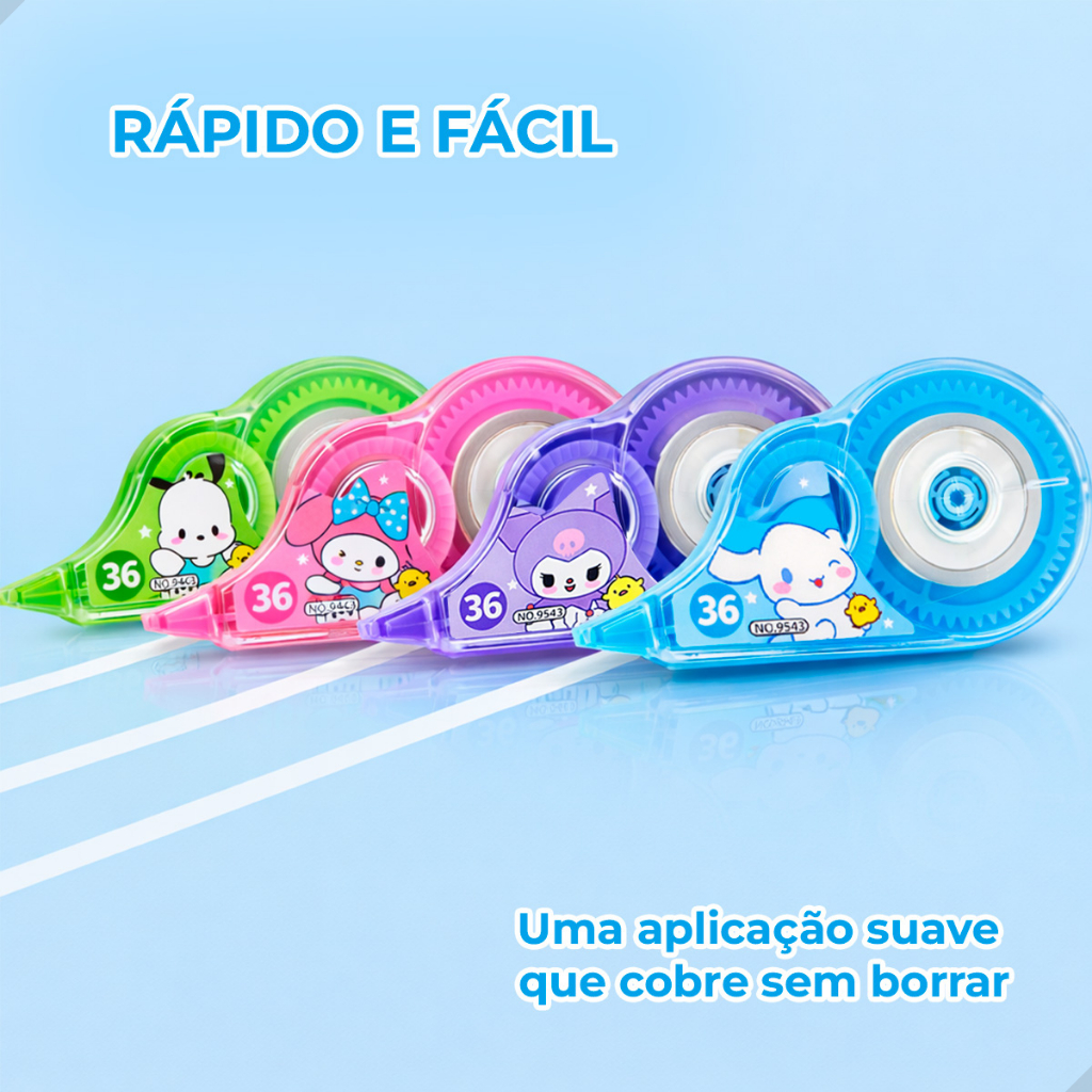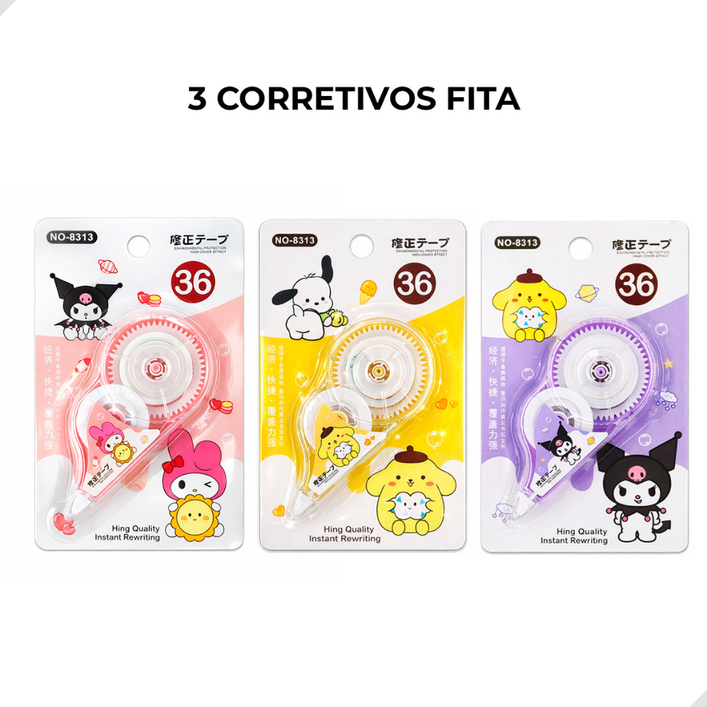 Kit Corretivo em Fita Turma da Hello Kitty 36 Metros Branquinho Sanrio 3 ou 4 Unidades Escolar