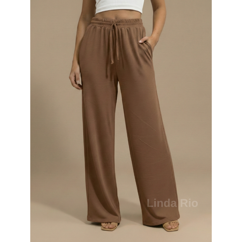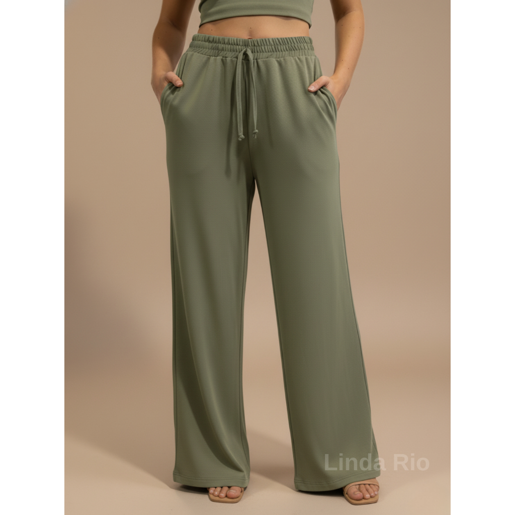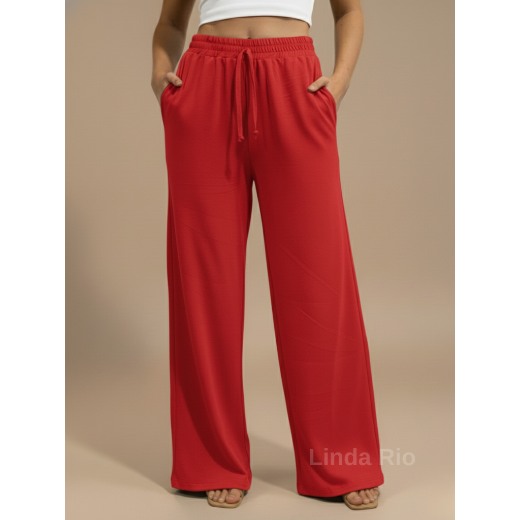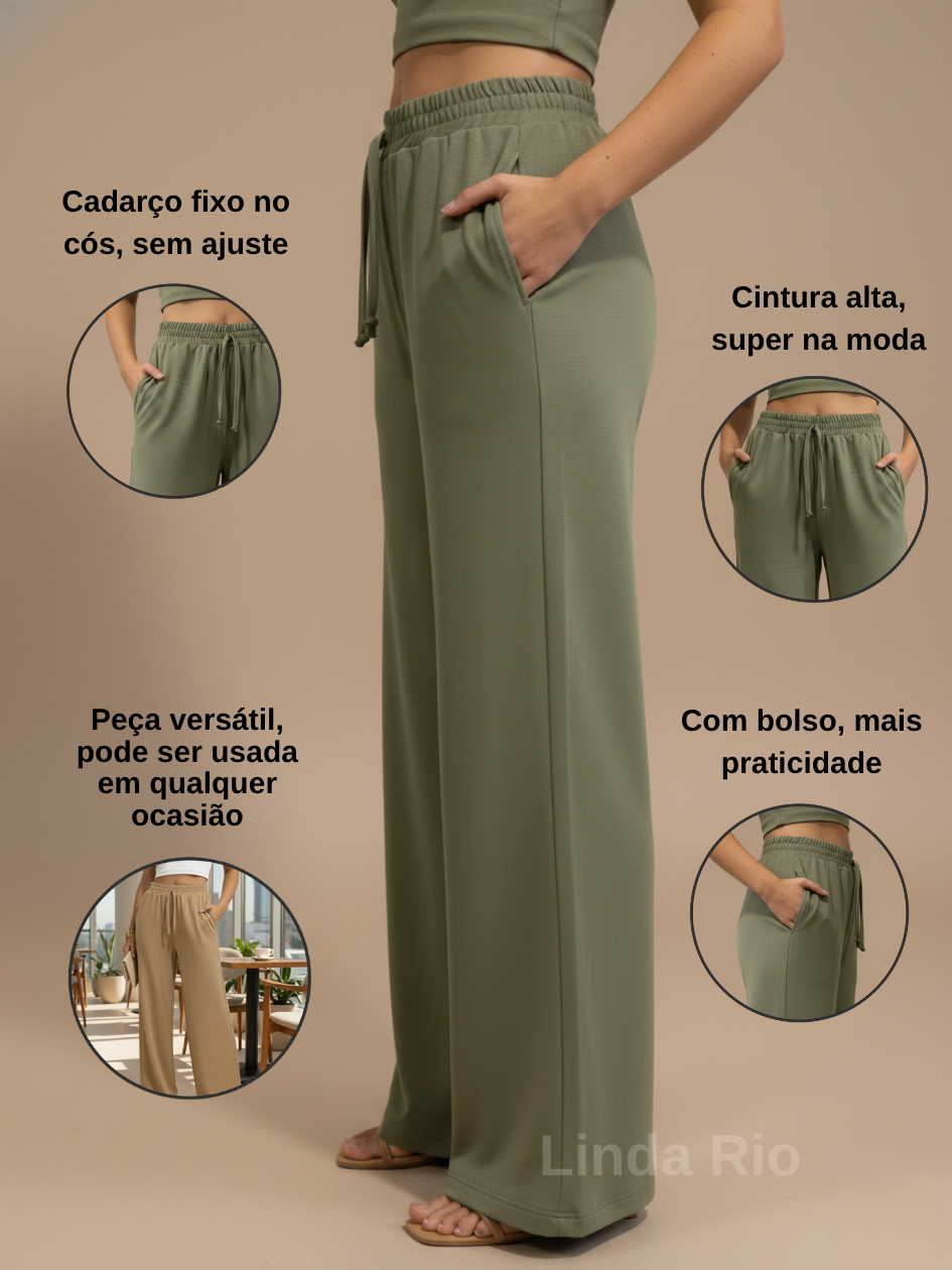 Calça Pantalona Feminina Com Bolso Cintura Alta Tecido Duna Verão