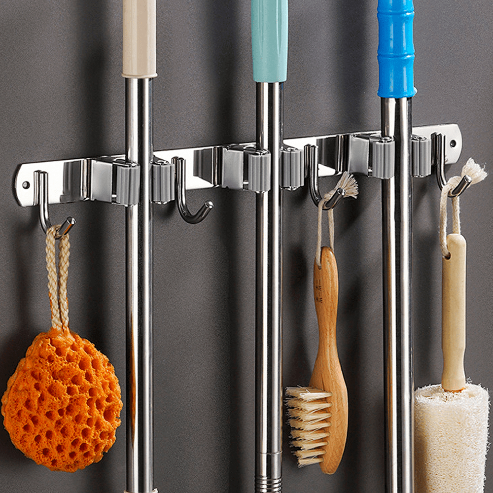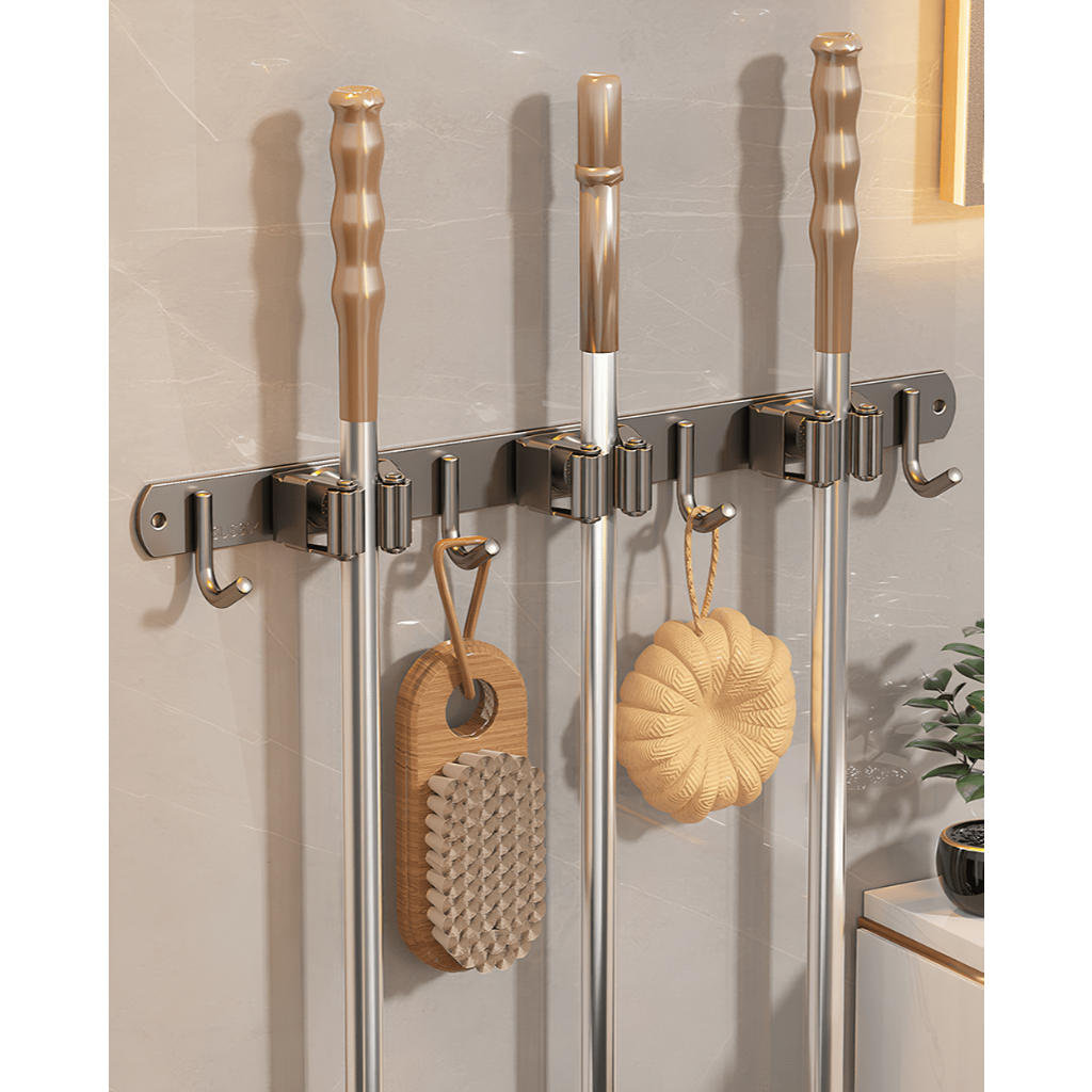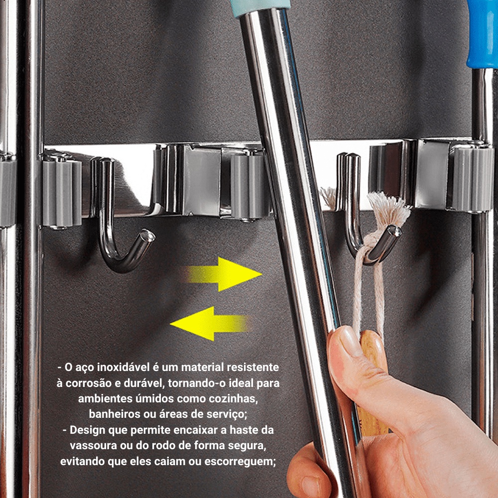 Porta Vassoura Rodo Mop Suporte Com Encaixes e Ganchos Multiuso Aço Inox Reforçado