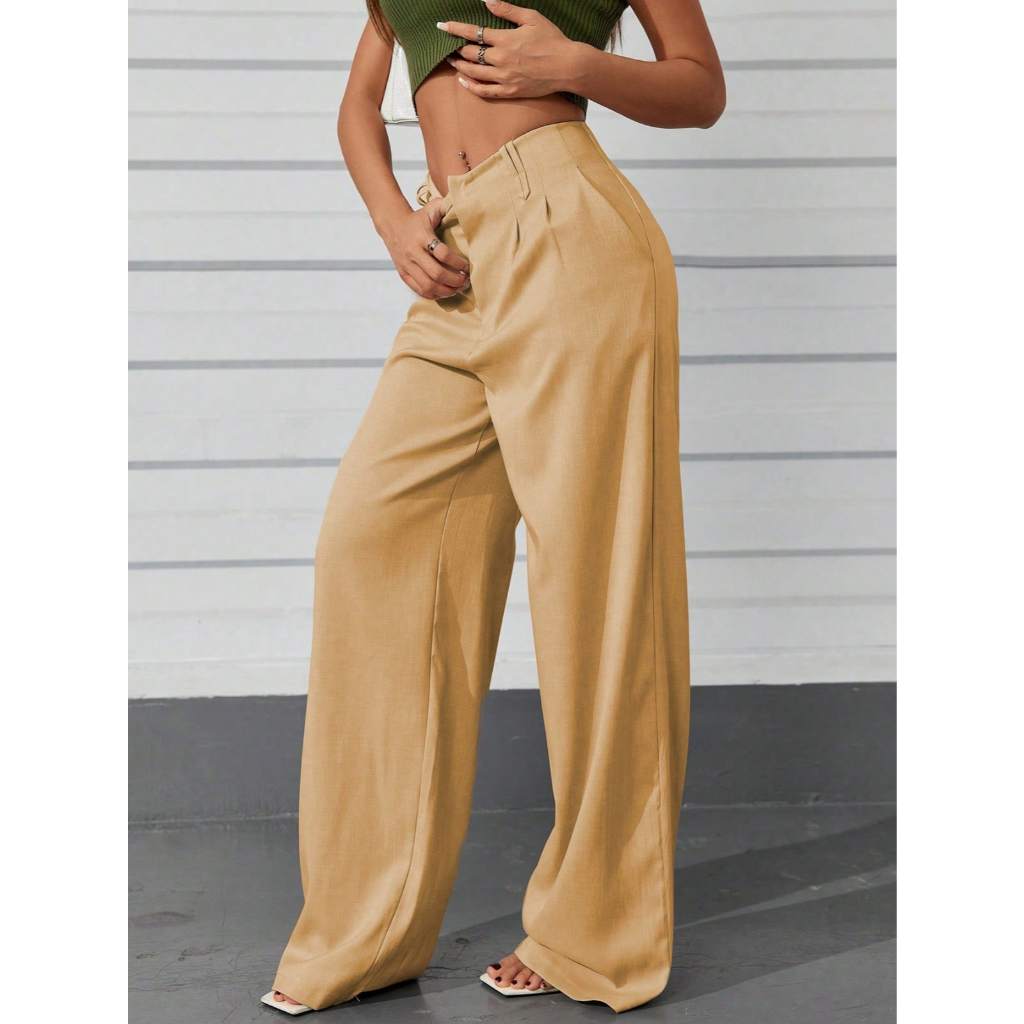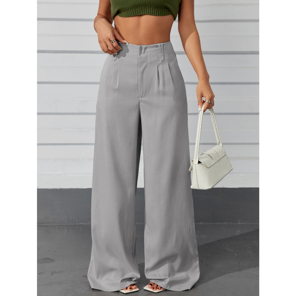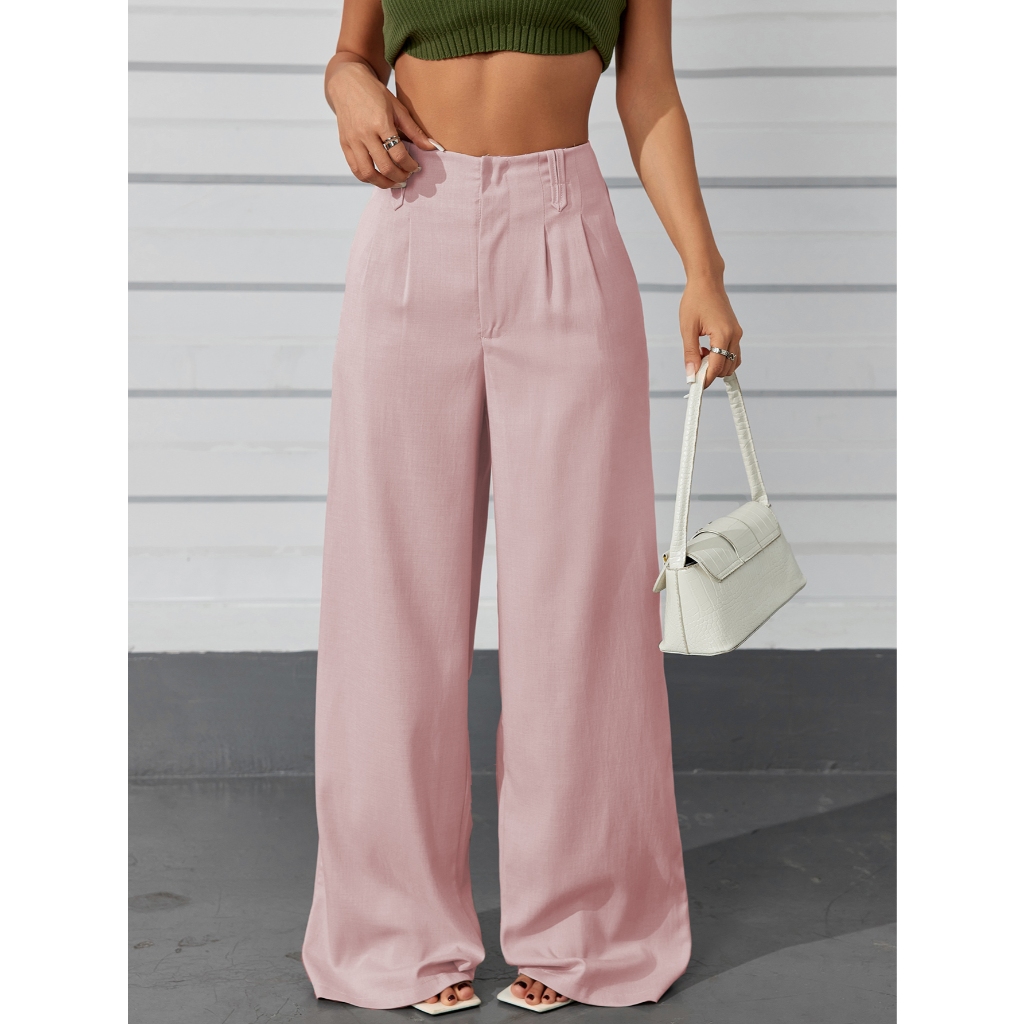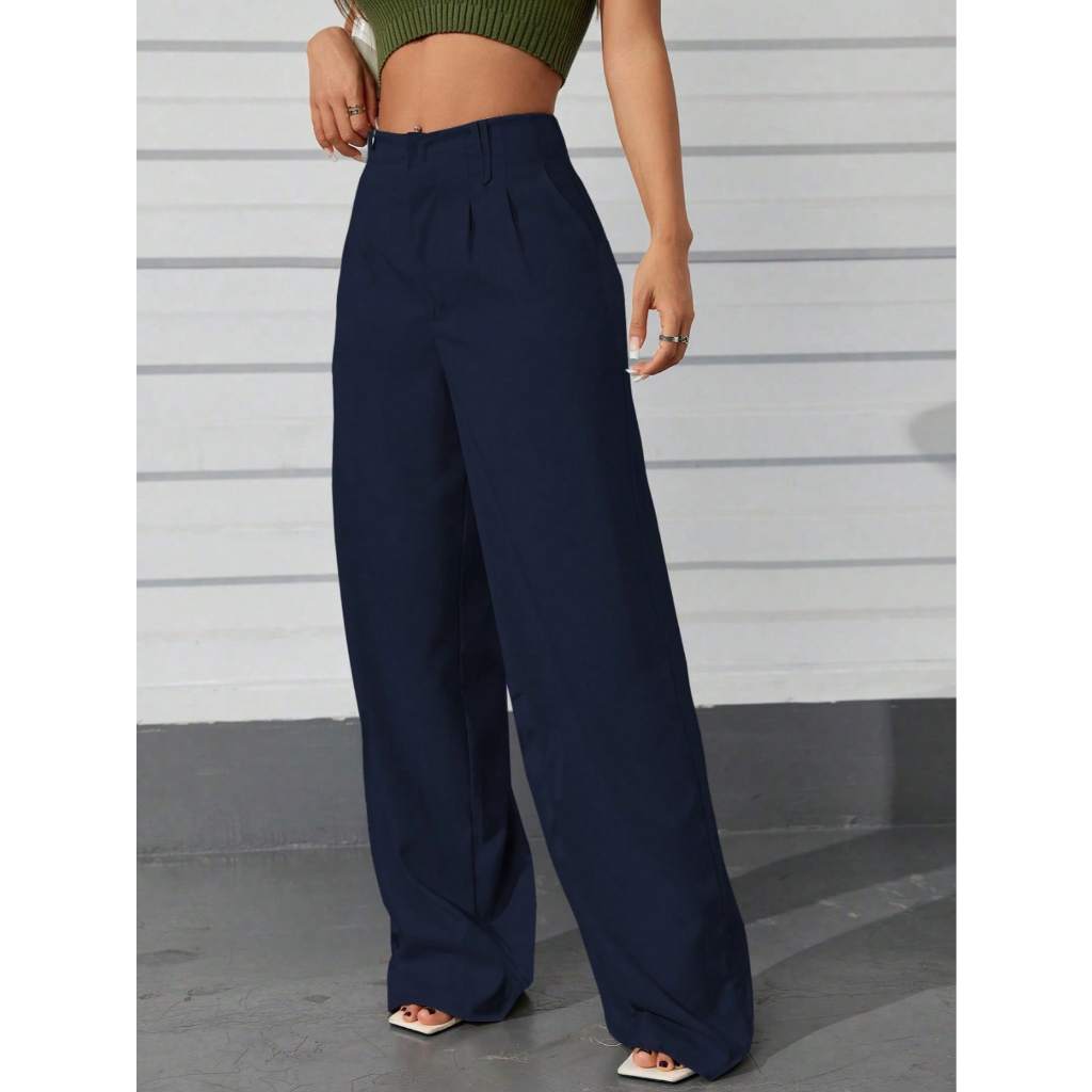 AS1401-Calças femininas de cintura alta e perna reta com botões ocultos