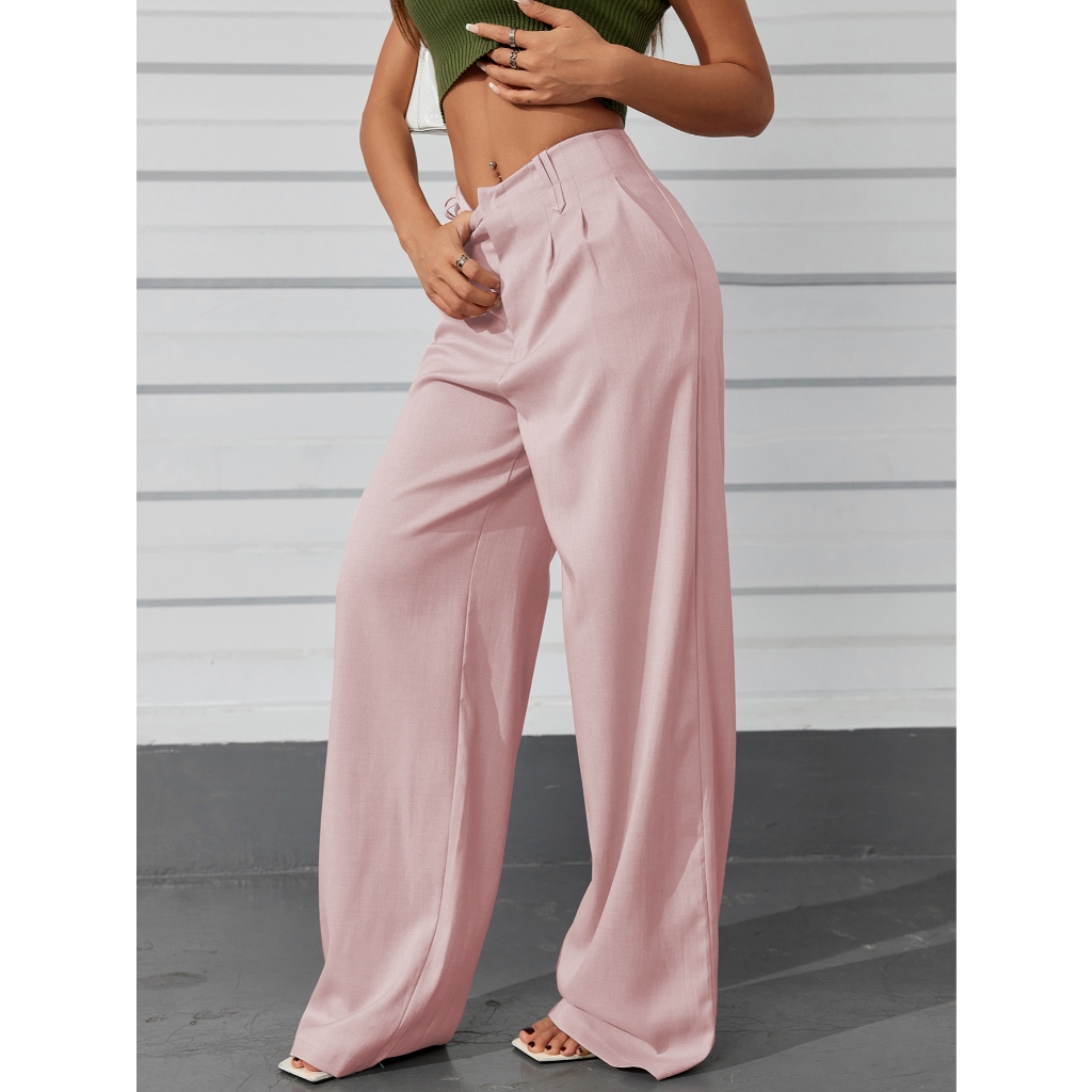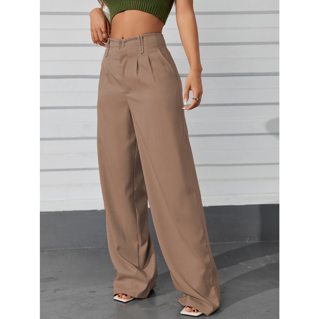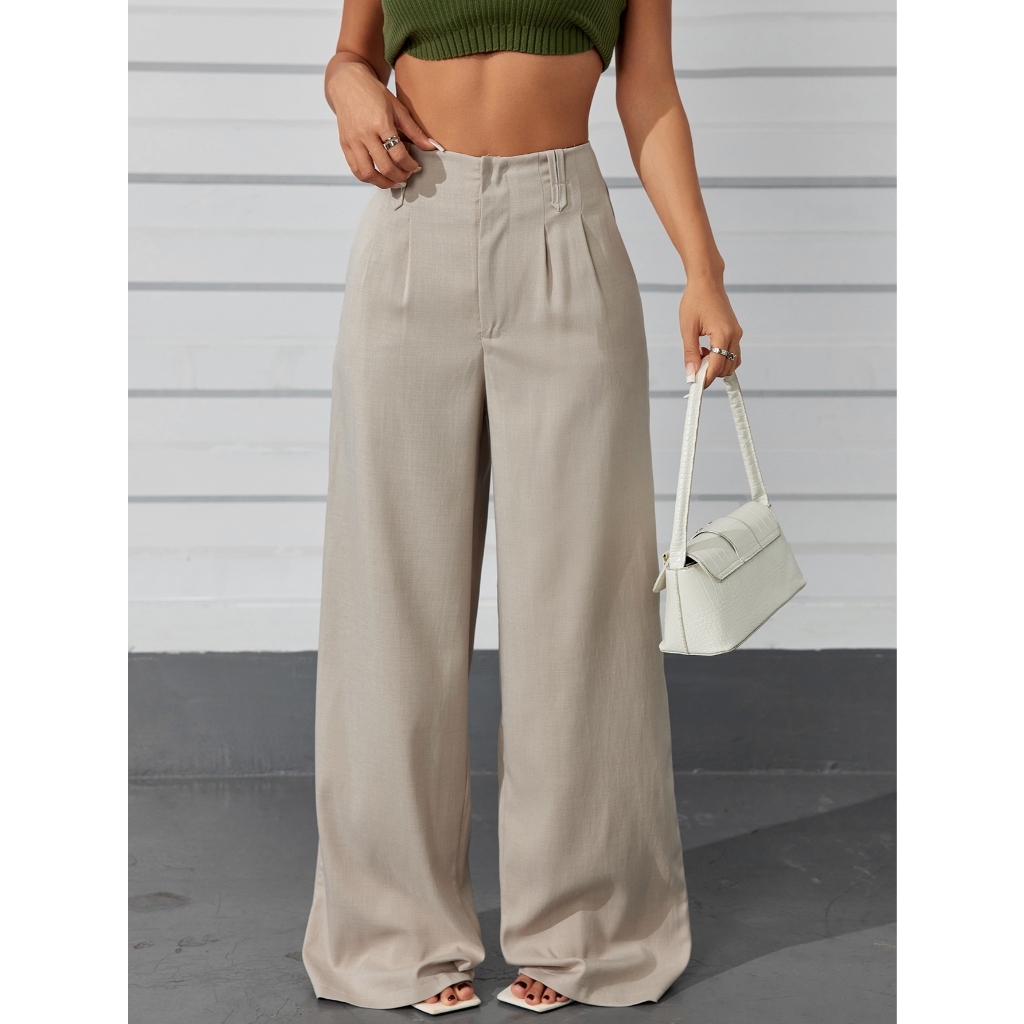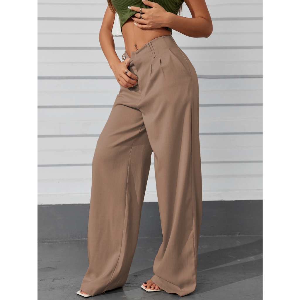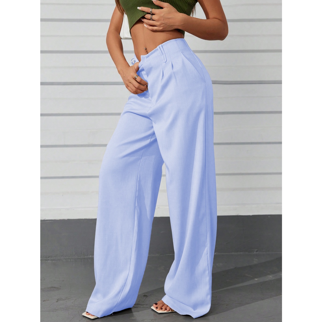 AS1401-Calças femininas de cintura alta e perna reta com botões ocultos