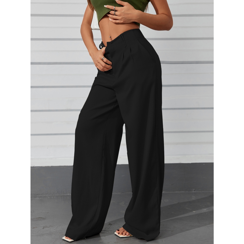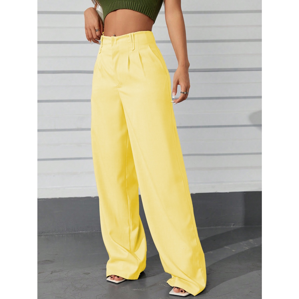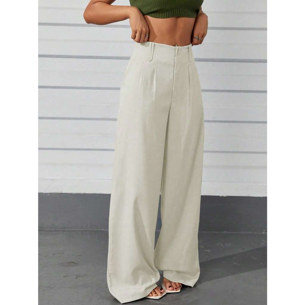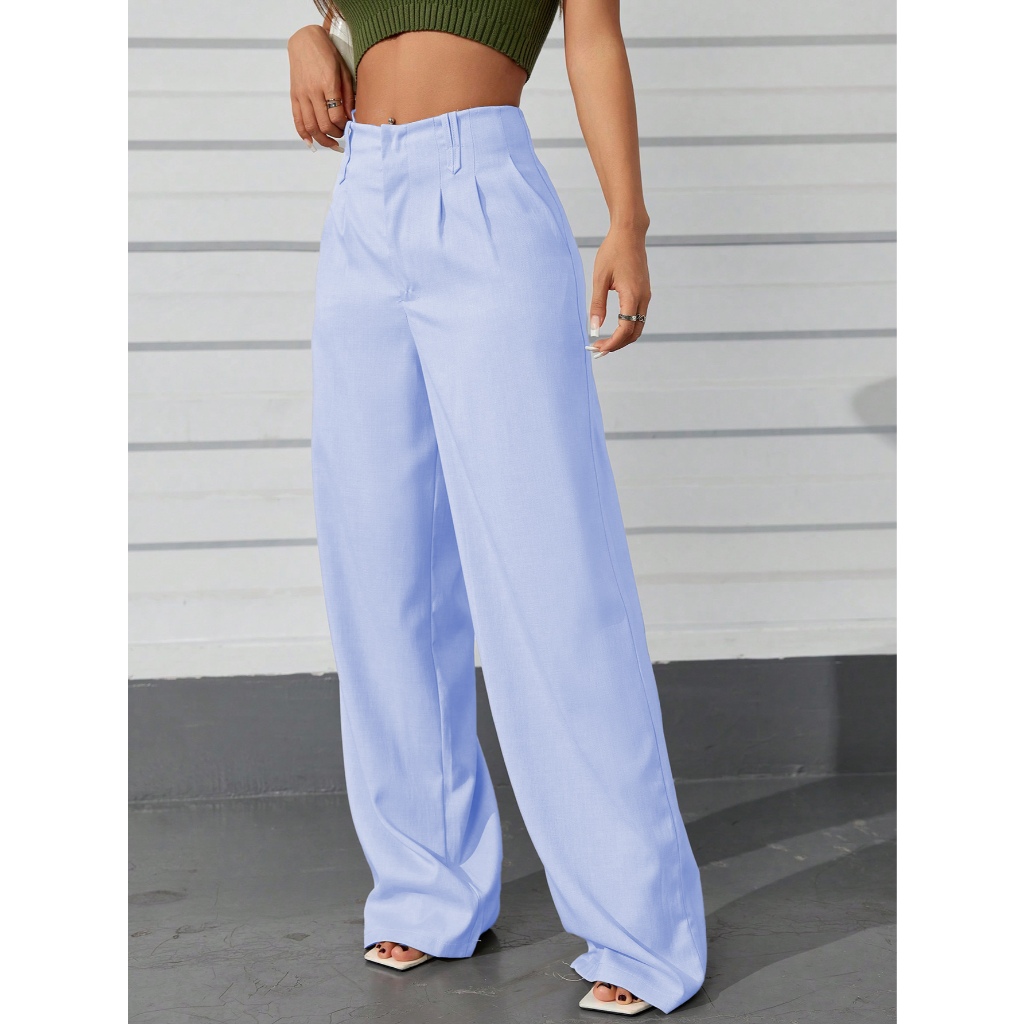 AS1401-Calças femininas de cintura alta e perna reta com botões ocultos