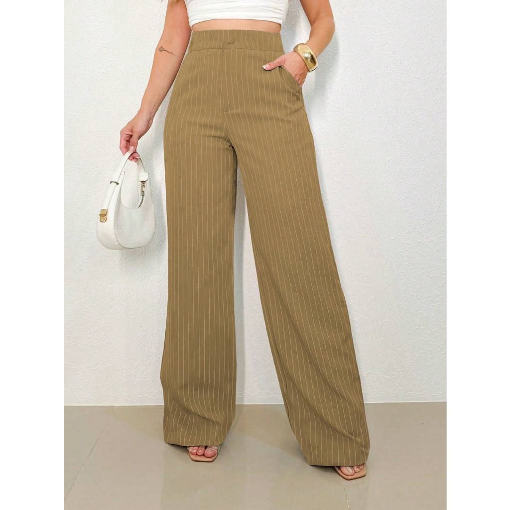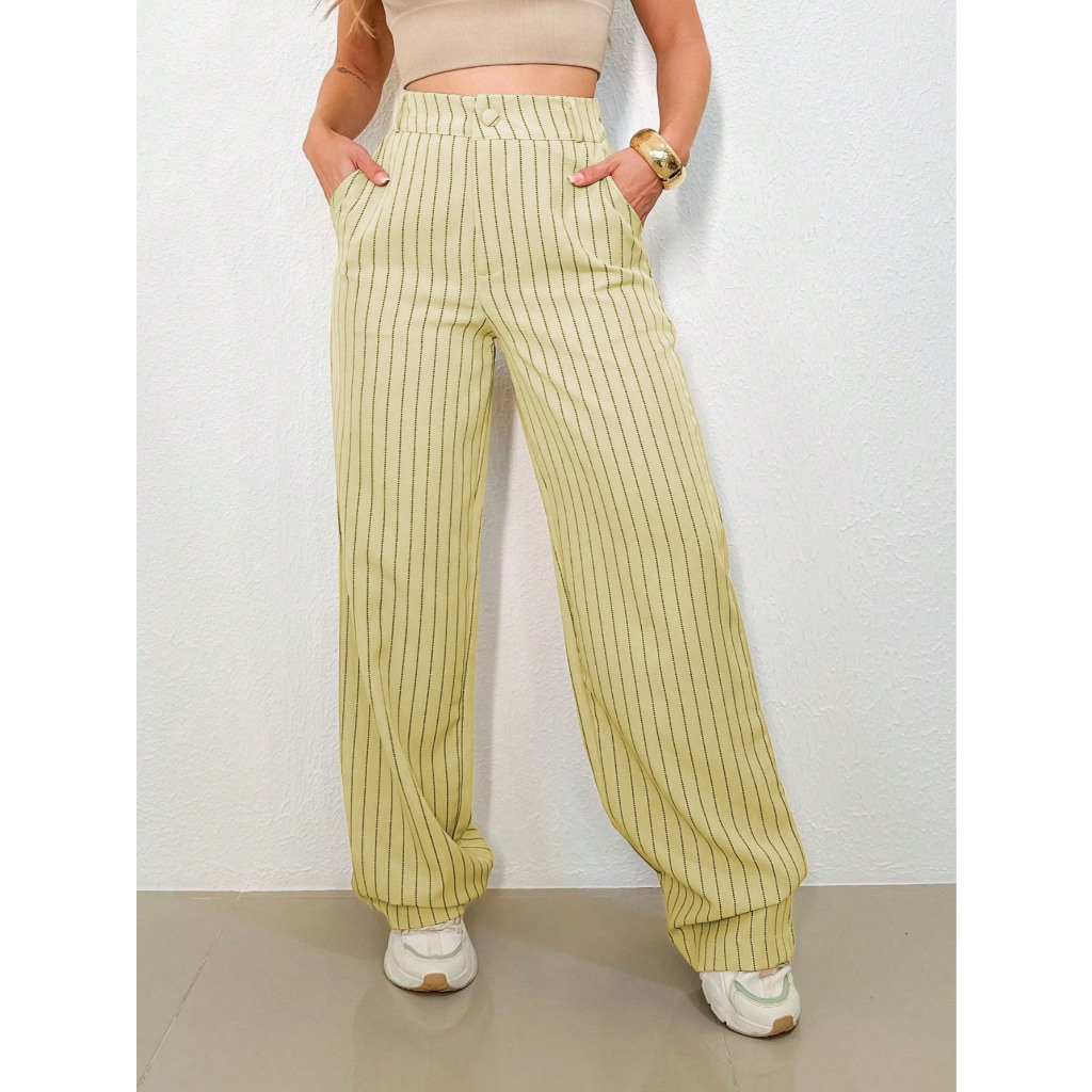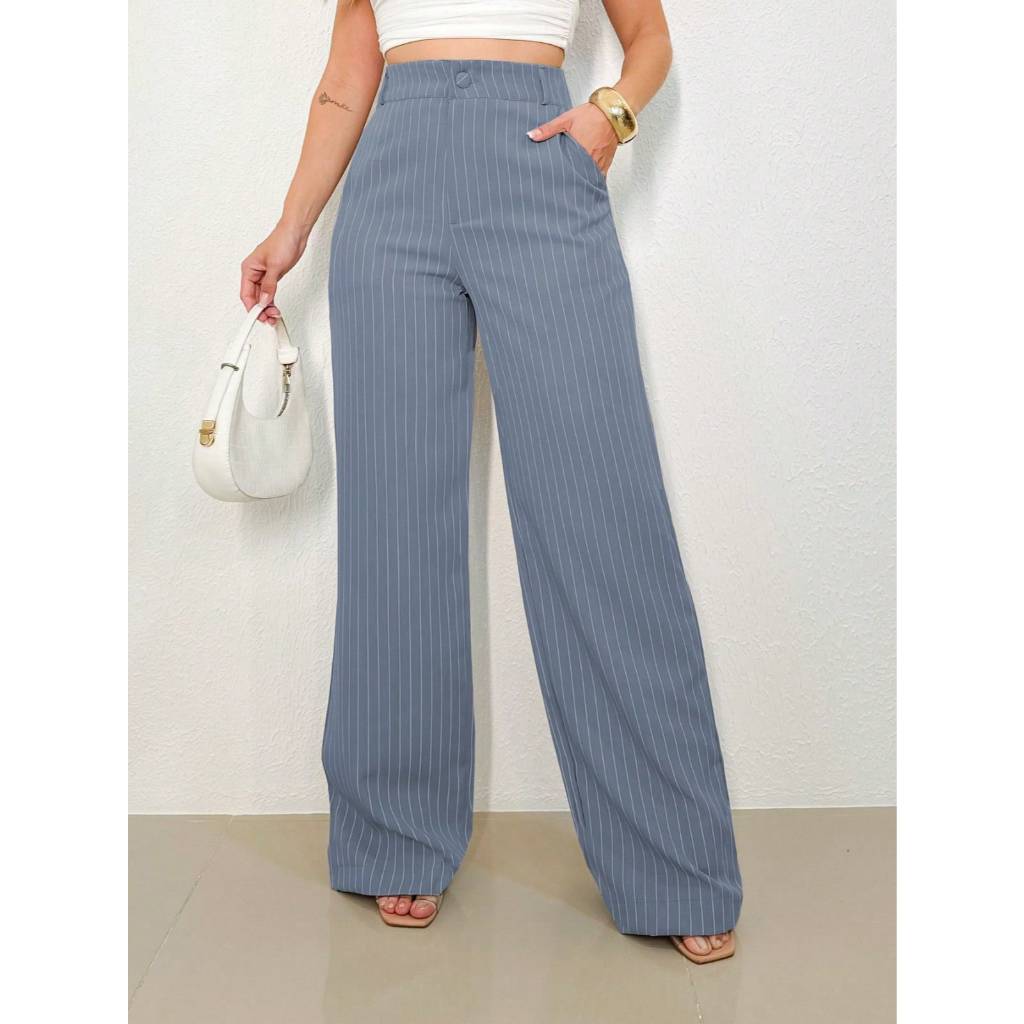 REF: H932 Calças Femininas Listradas, Cintura Alta, Perna Larga, Elegante, Casual, Formal, Leve,