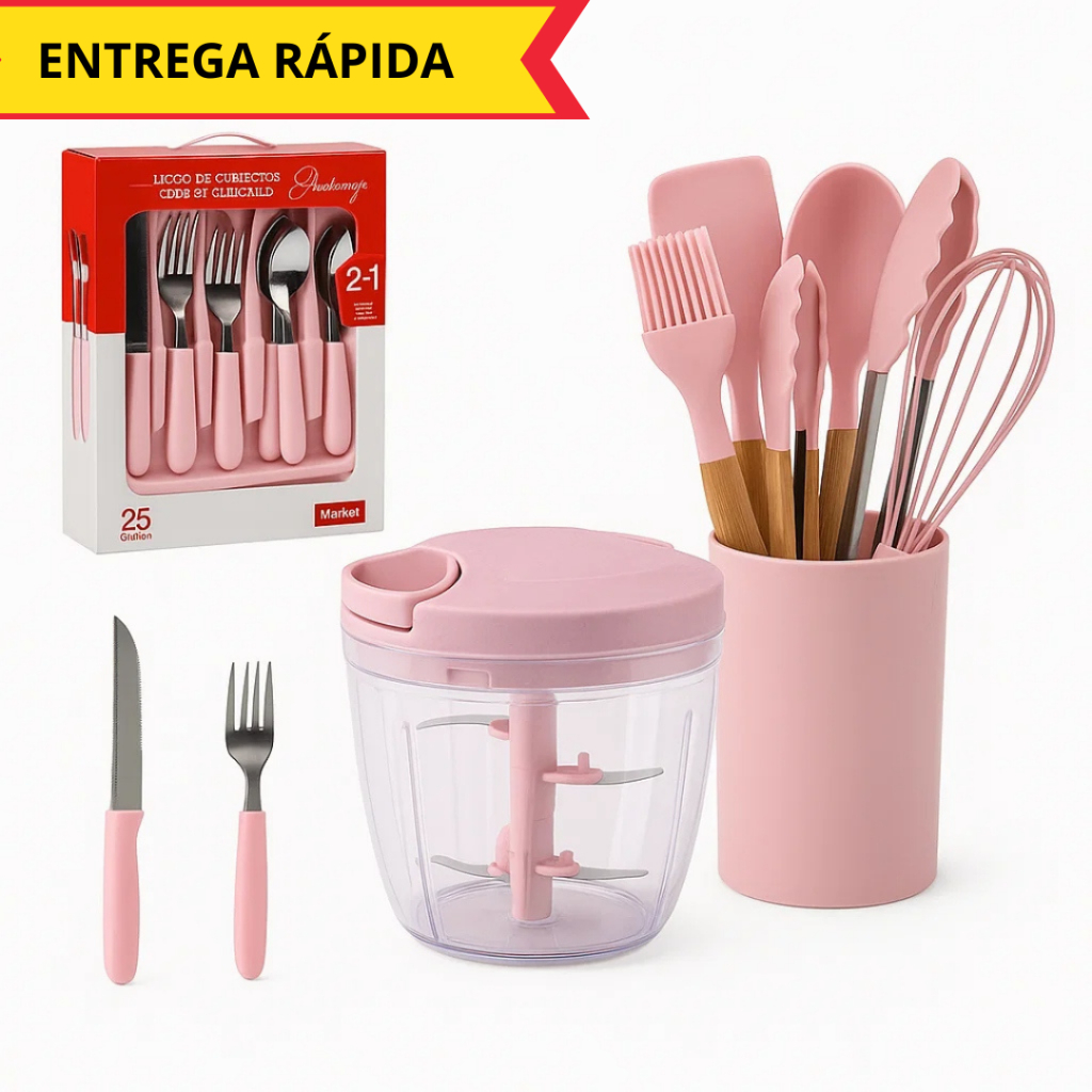 Kit Cozinha Rosa Faqueiro + Processador + Jogo de Utensílios De Silicone