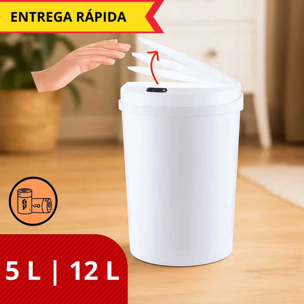 Lixeira Automática 5 | 12Litros Redonda Sensor Presença Banheiro Cozinha Escritório Tampa Inteligente