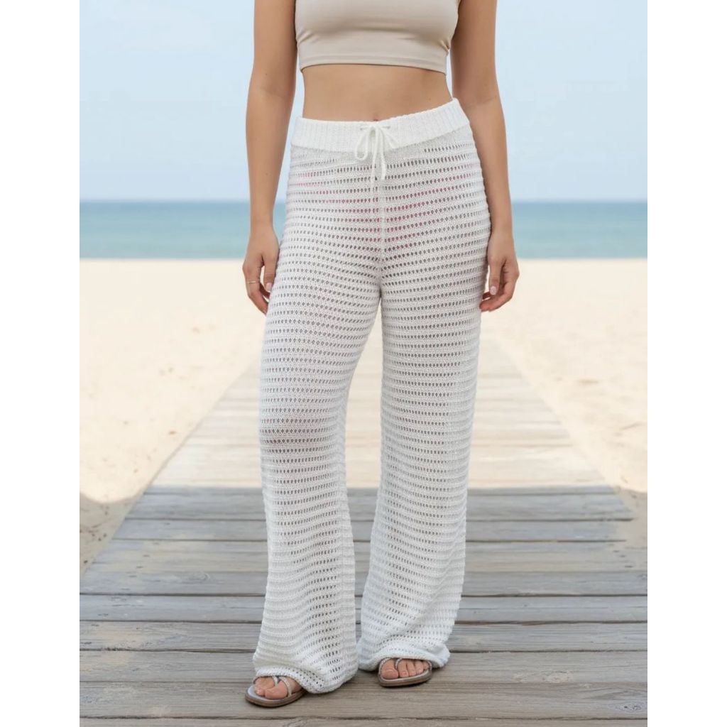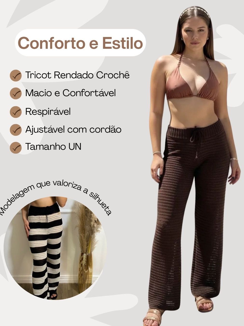 Calça Feminina com Cordão Saída de Praia Leve Verão Lisa Listrada Pantalona Tricot Ponto Crochê