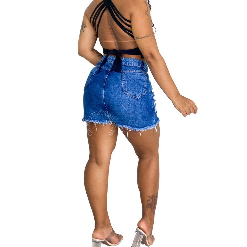 Saia Jeans Feminina Cintura Alta Destroyed Ziper