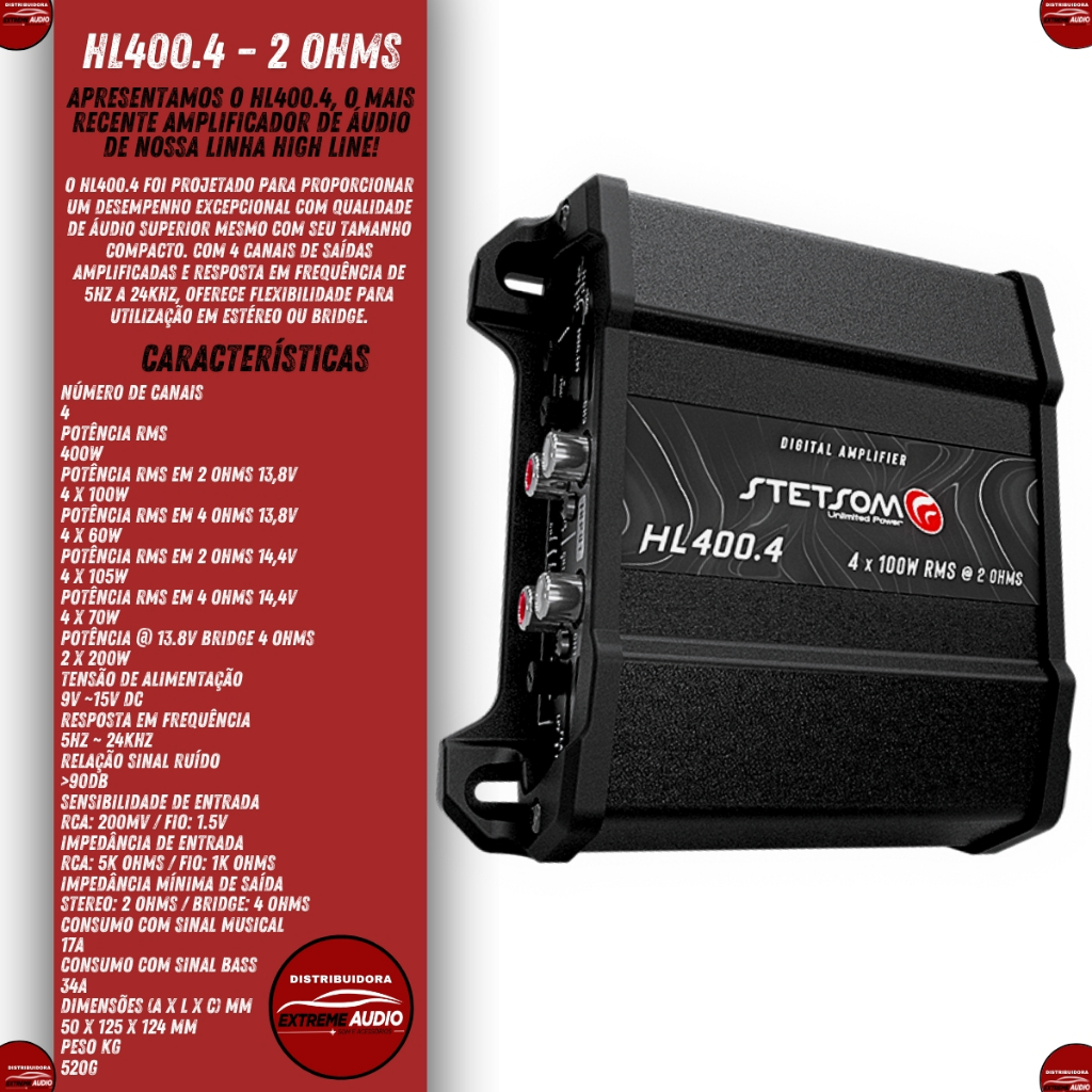 Módulo Amplificador Stetsom Hl400.4 400W Potência 4 Canais Potencia Bridge High Line"