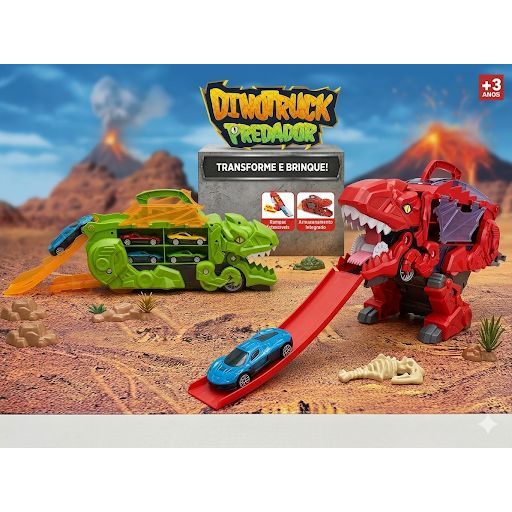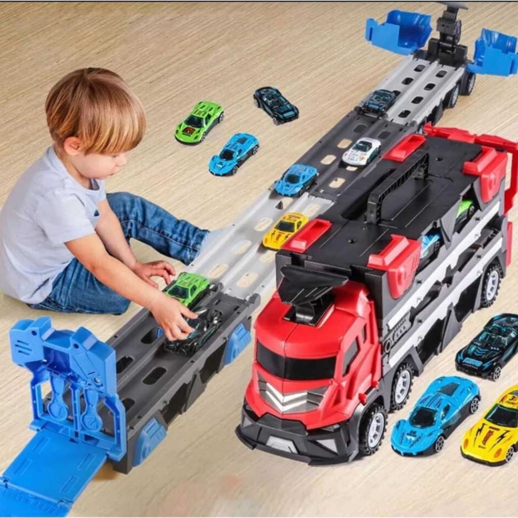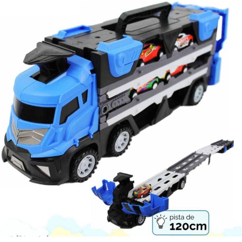 Caminhão Cegonha Diossauro Tranforma Pista Com Lançador Maleta 6 Carrinhos