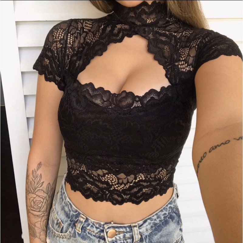 Cropped /blusa De Renda Aberto Com Bojo E Decote