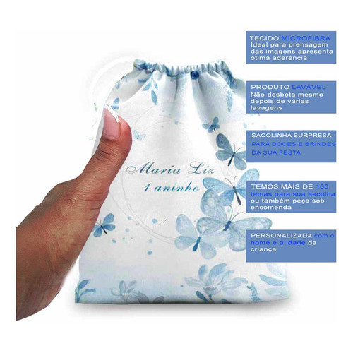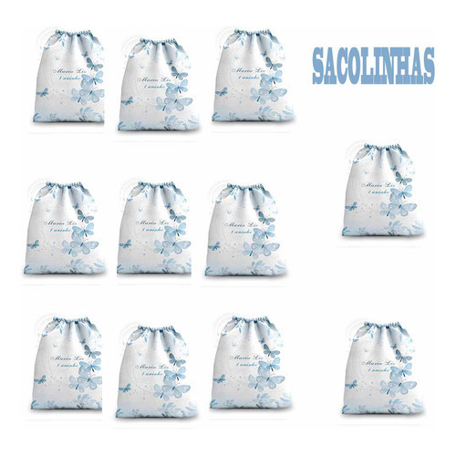 10 Sacolinhas Personalizadas tecido Jardim Borboletas Azul Bebe 30 cm x 20 cm