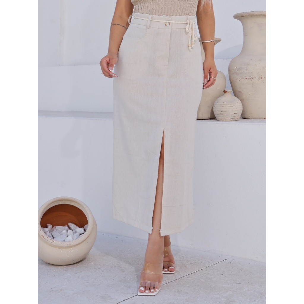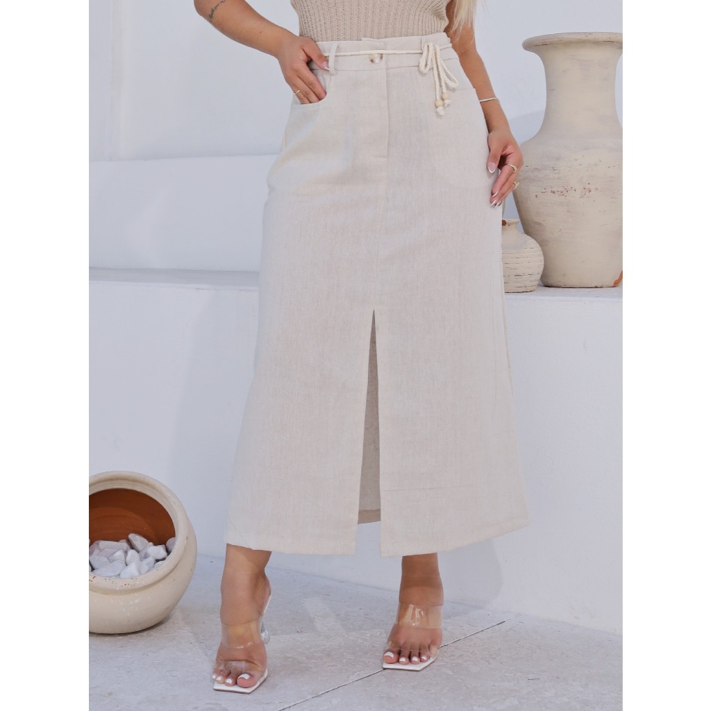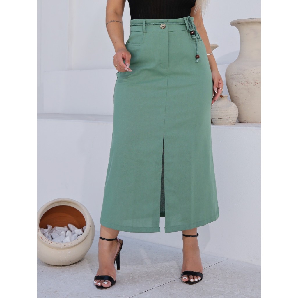 Saia Longa Feminina Linho com Fenda frontal PAULA com bolsos e cordão no cós evangélica