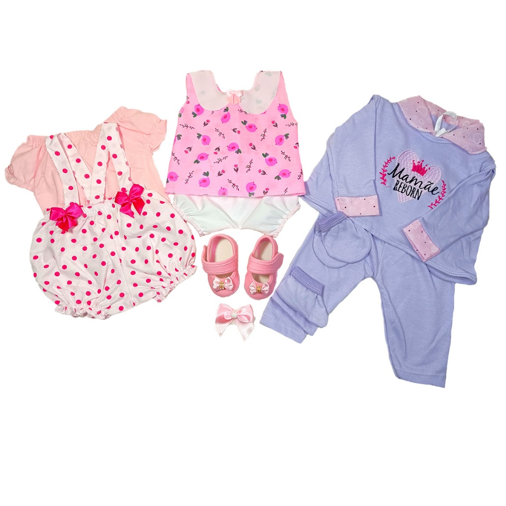 Kit Roupinha Bebê Reborn 2 Jardineiras + Pijama 5 Peças + Tiara + Sapatinho