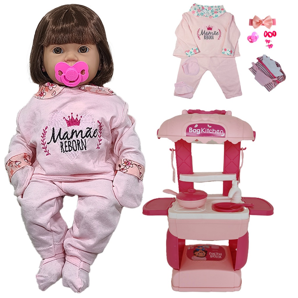 KIT Boneca Bebê Mamãe Reborn 45cm + Mini Cozinha
