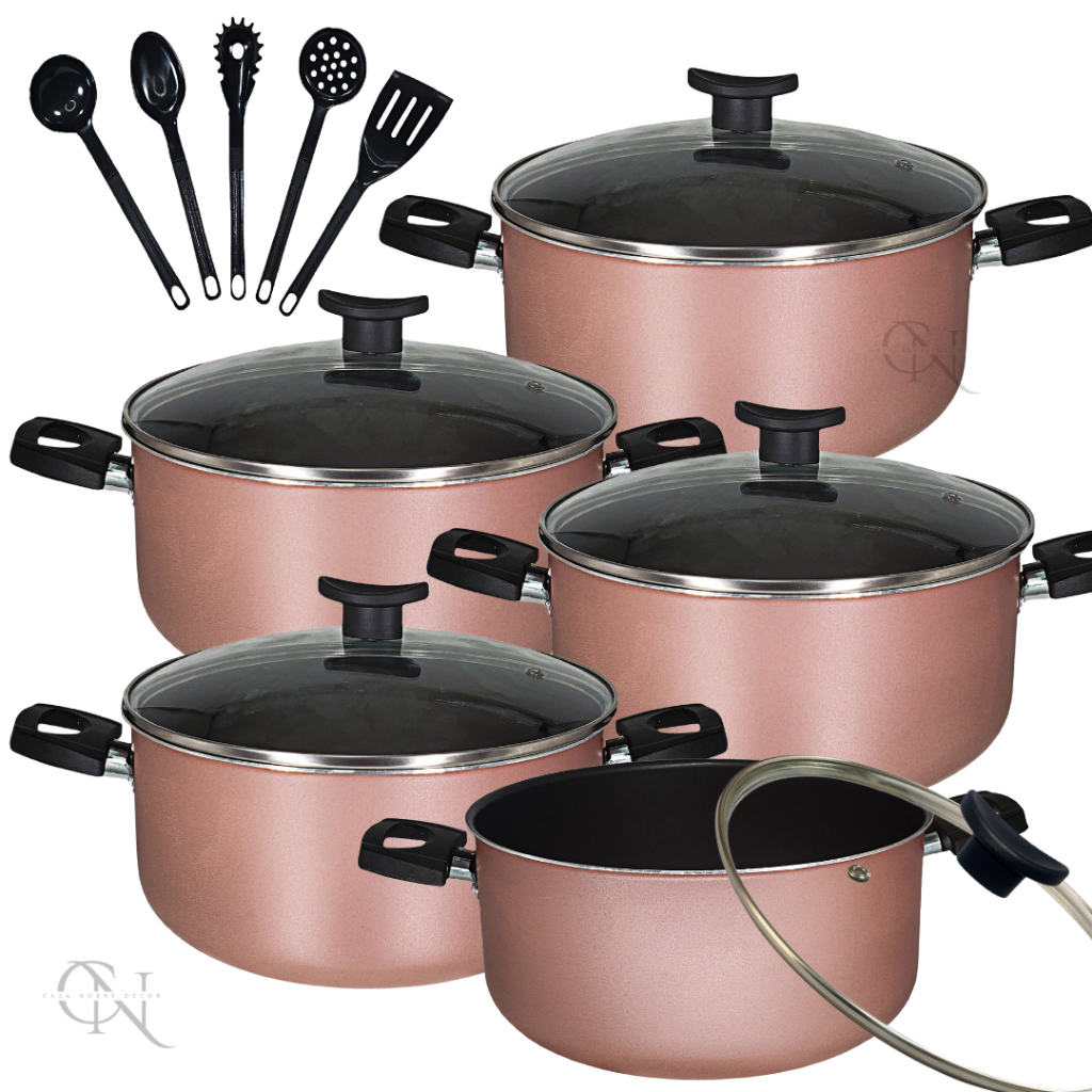 Kit Jogo de Panelas 10 peças Caçarolas Antiaderente Teflon com Tampa Vidro e Utensílios