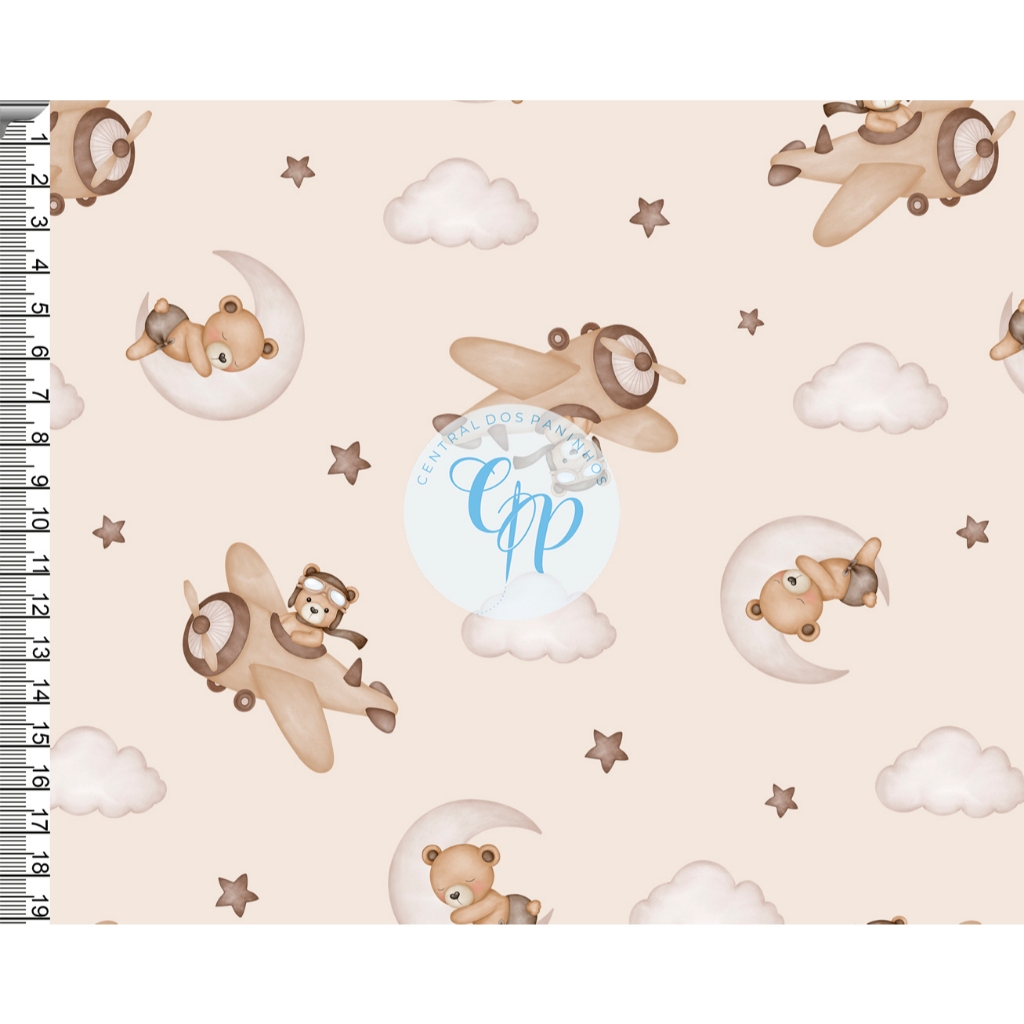 Tecido tricoline, microfibra ou gabardine - Ursinho Aviador - Fundo Bege - 0.50CM