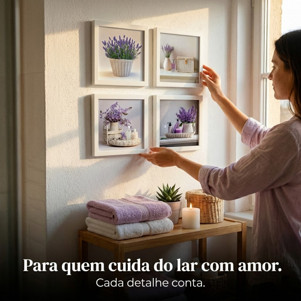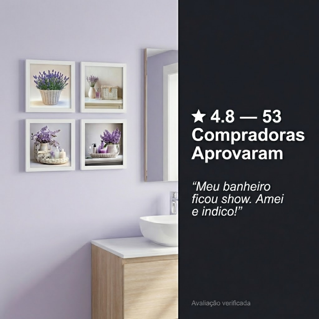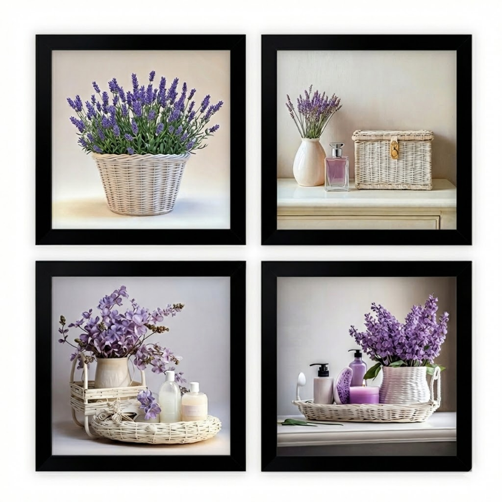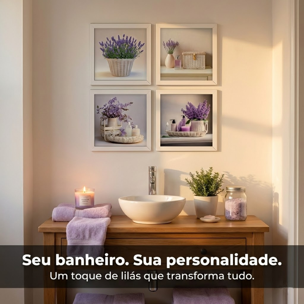 Kit 4 Quadros 18x18 cm banheiro, lavabo, flores lilás, vidro