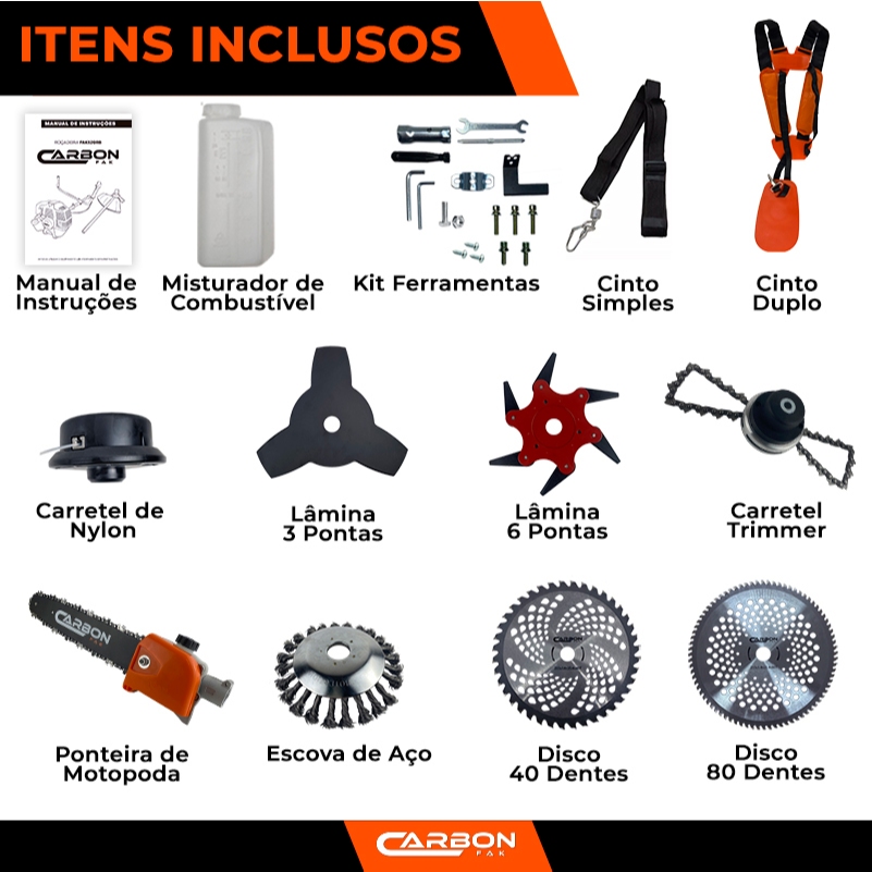 Roçadeira a Gasolina Bipartida com Motopoda de Galhos e Kit Discos Multifuncional 52cc 2,5HP Carbon Fak