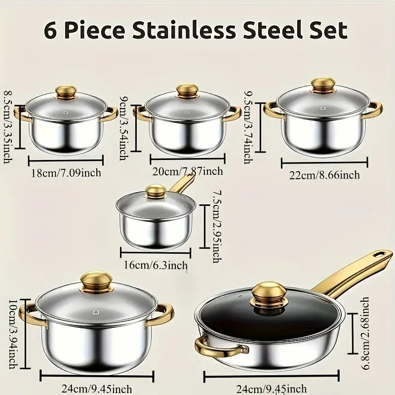Conjunto em aço inoxidável 12PCS Antiaderente 5 Panelas com Tampa e Uma Frigideira Com Tampa, Fino Acabamento