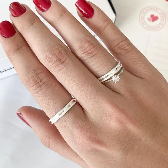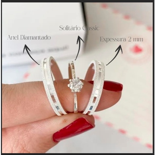 Alianças de namoro Prata950 3mm friso central diamantadas + Anel Solitario e nomes