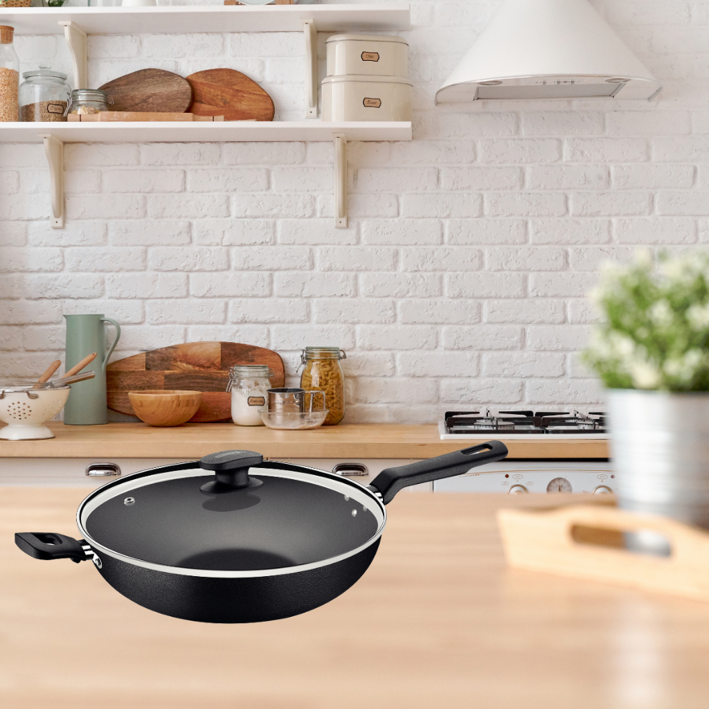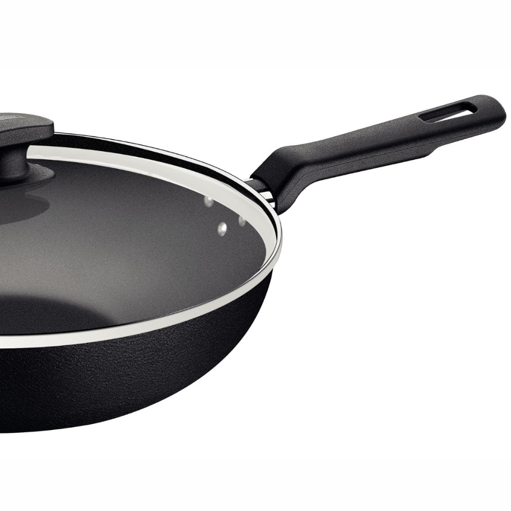 Panela Wok Tramontina 28cm 3,3l Loreto Antiaderente com tampa de vidro forno fogão assados cozidos churrasco