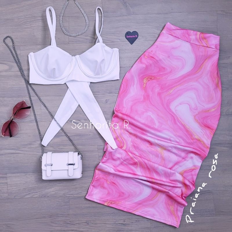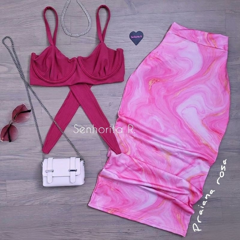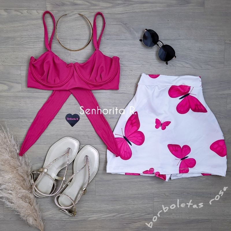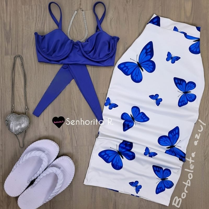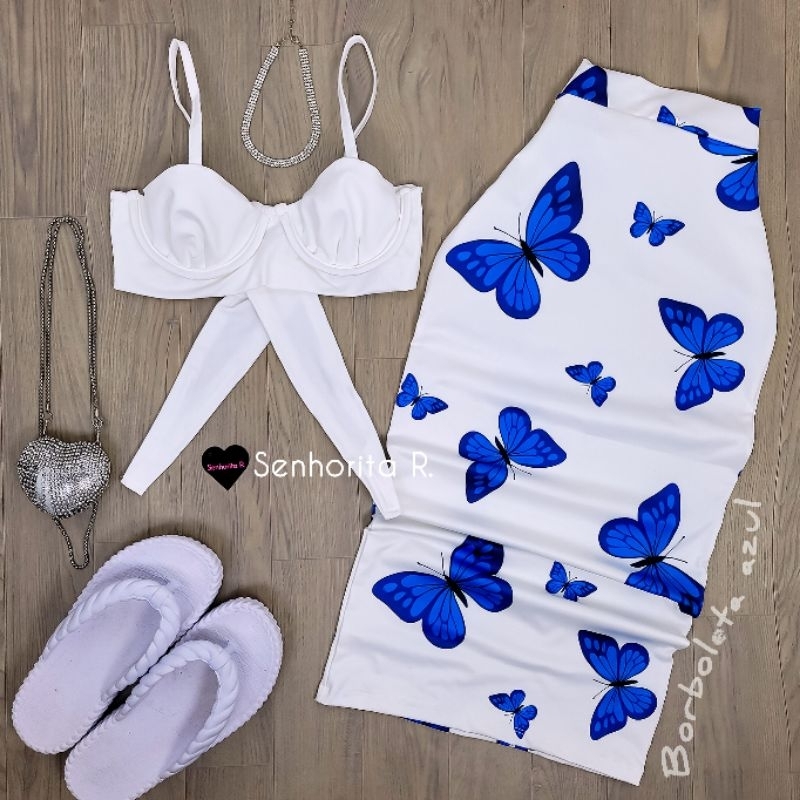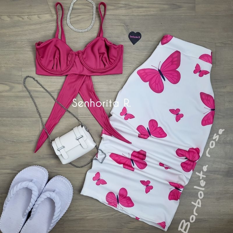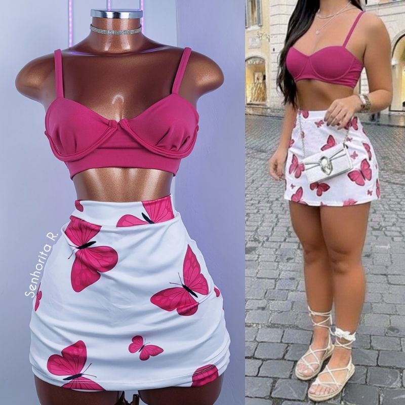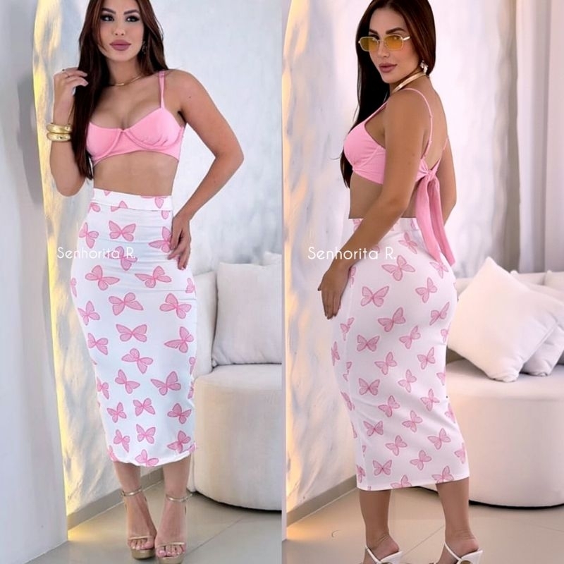 LANÇAMENTO Conjunto Saia e Cropped top Aro Estampado estampa borboleta rosa tropical verão moda paty feminina midi curto