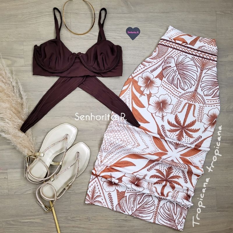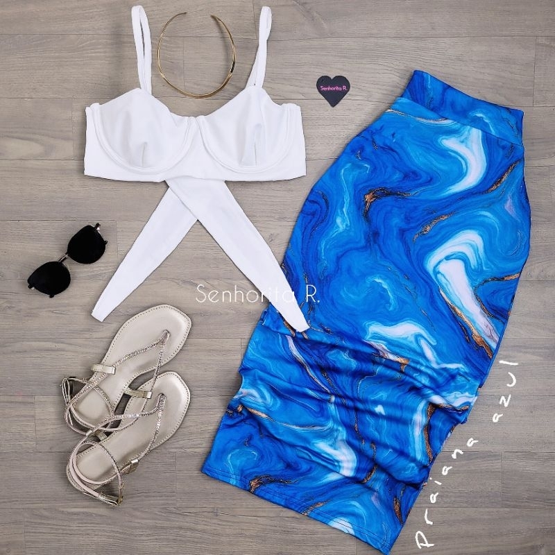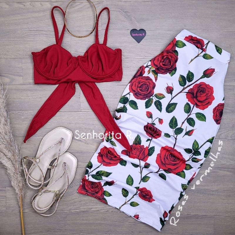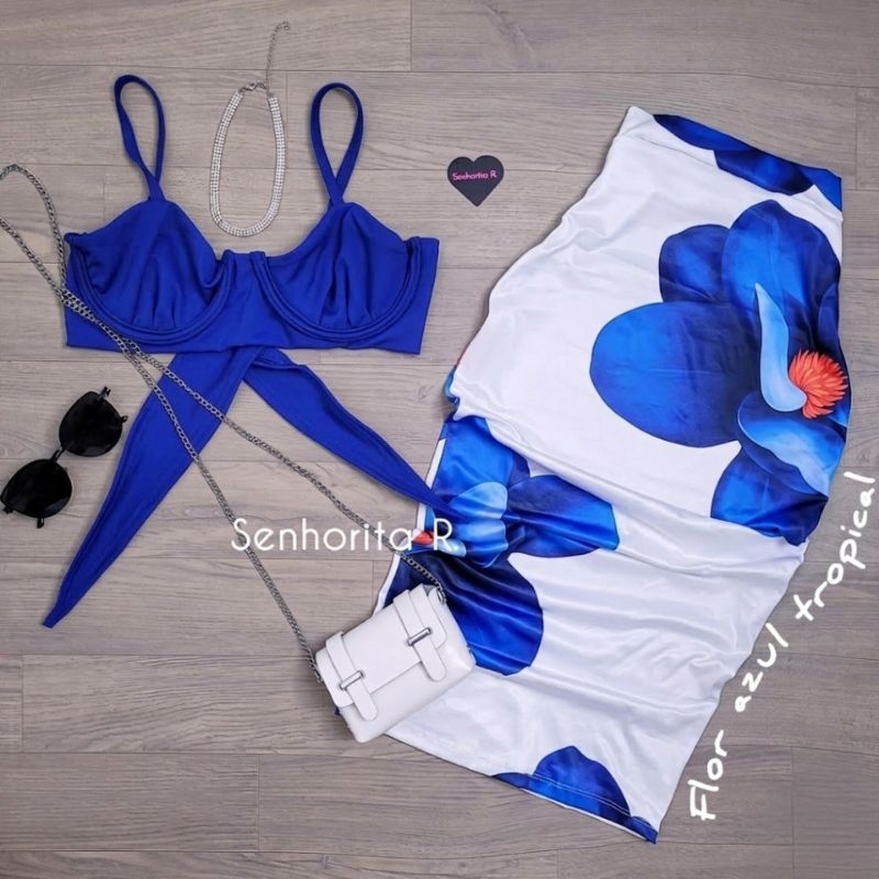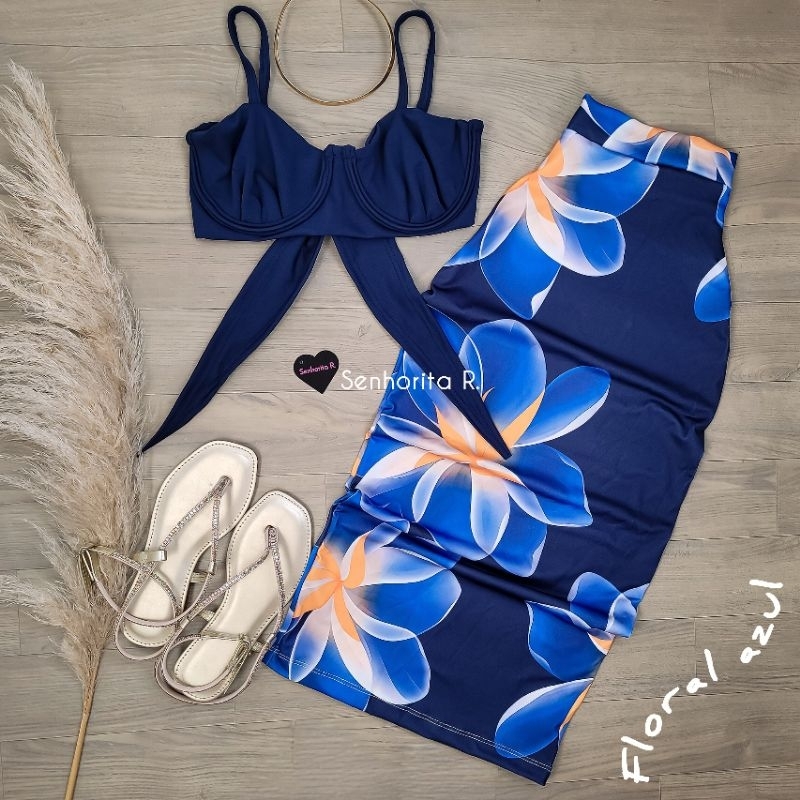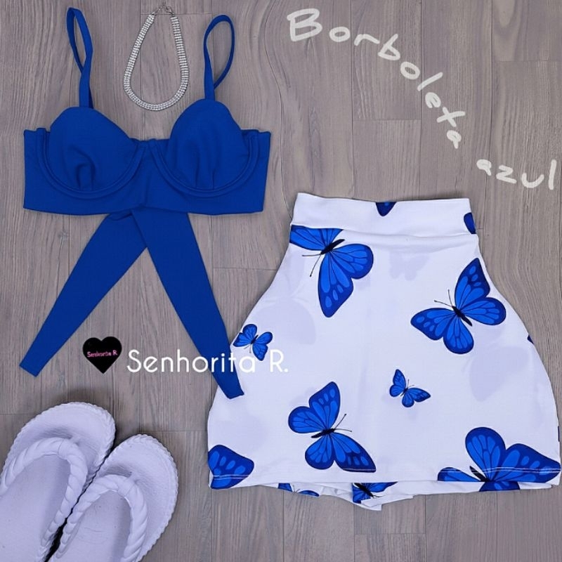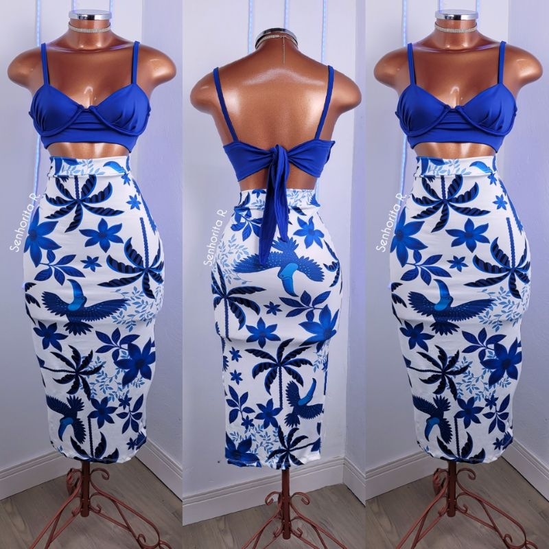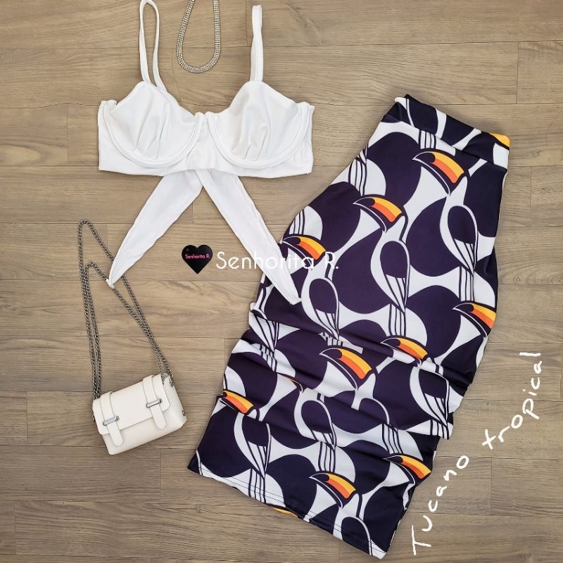 LANÇAMENTO Conjunto Saia e Cropped top Aro Estampado estampa borboleta rosa tropical verão moda paty feminina midi curto