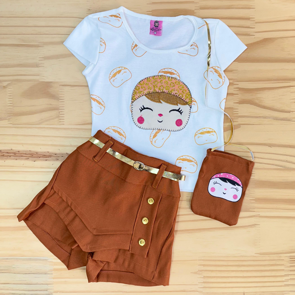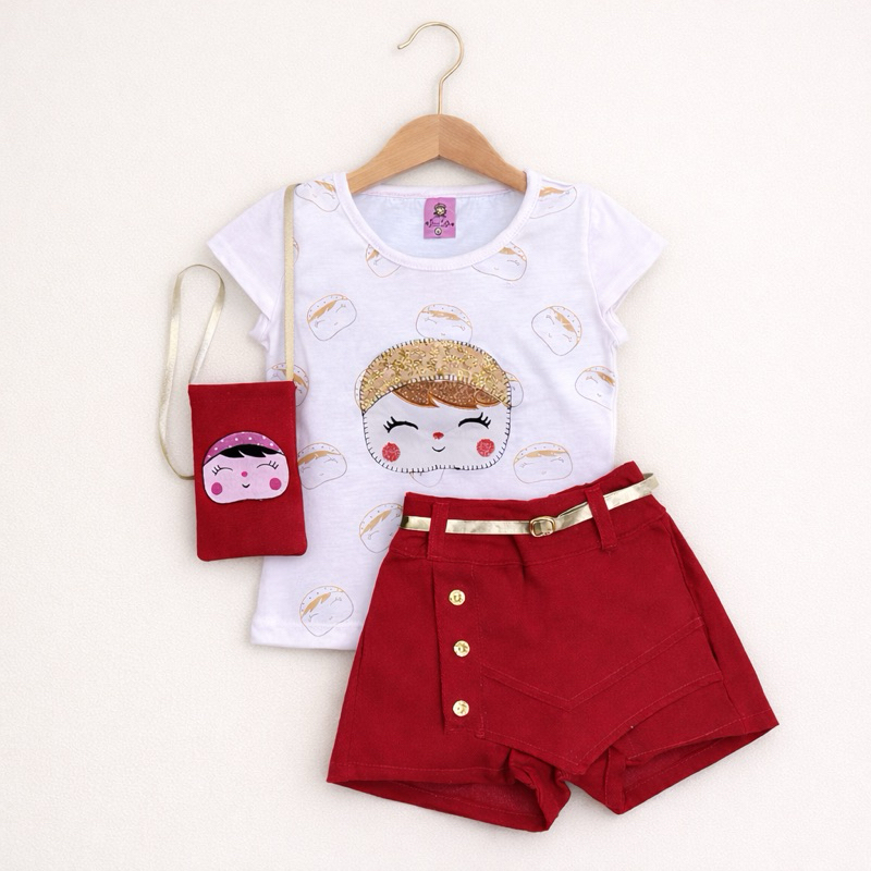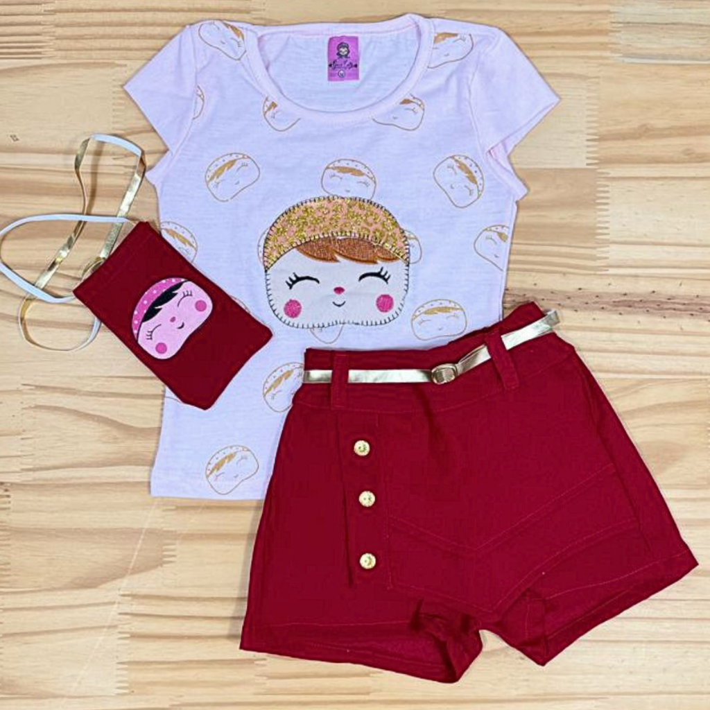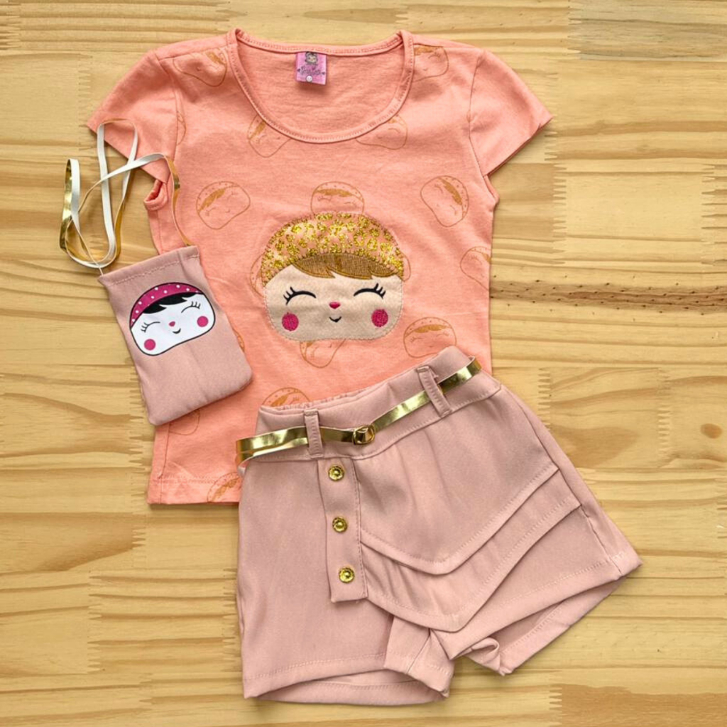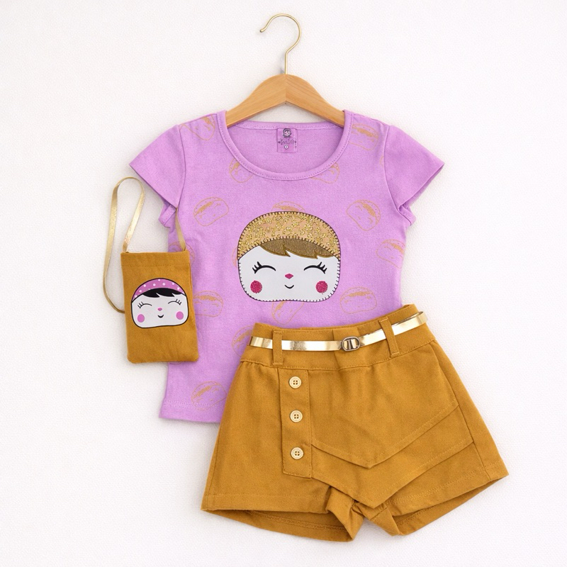 Conjunto Infantil Meninas Camiseta, Shorts Saia e Bolsinha Conjunto Social Blogueirinha Feminino