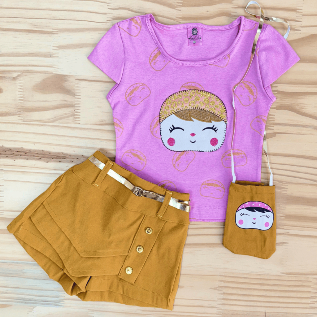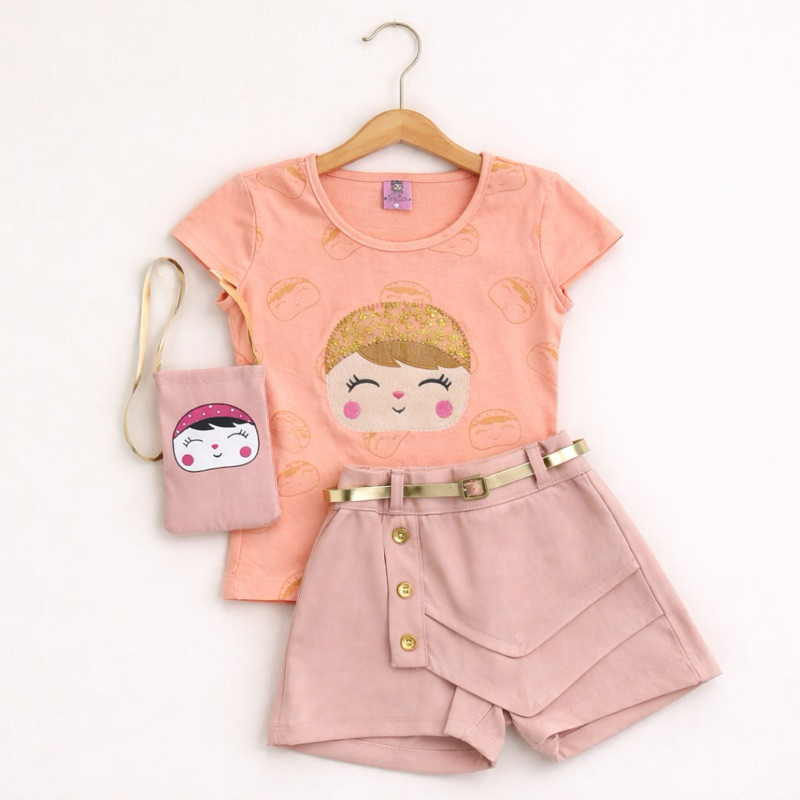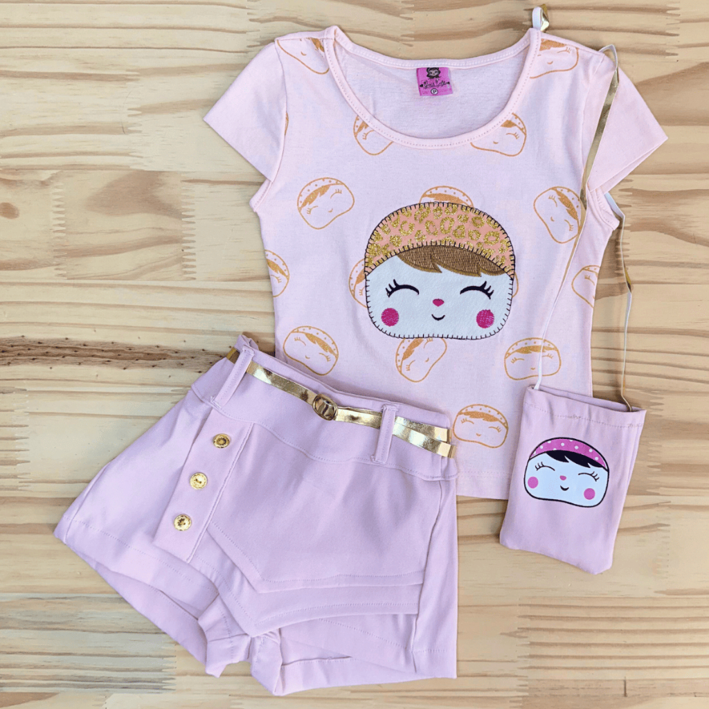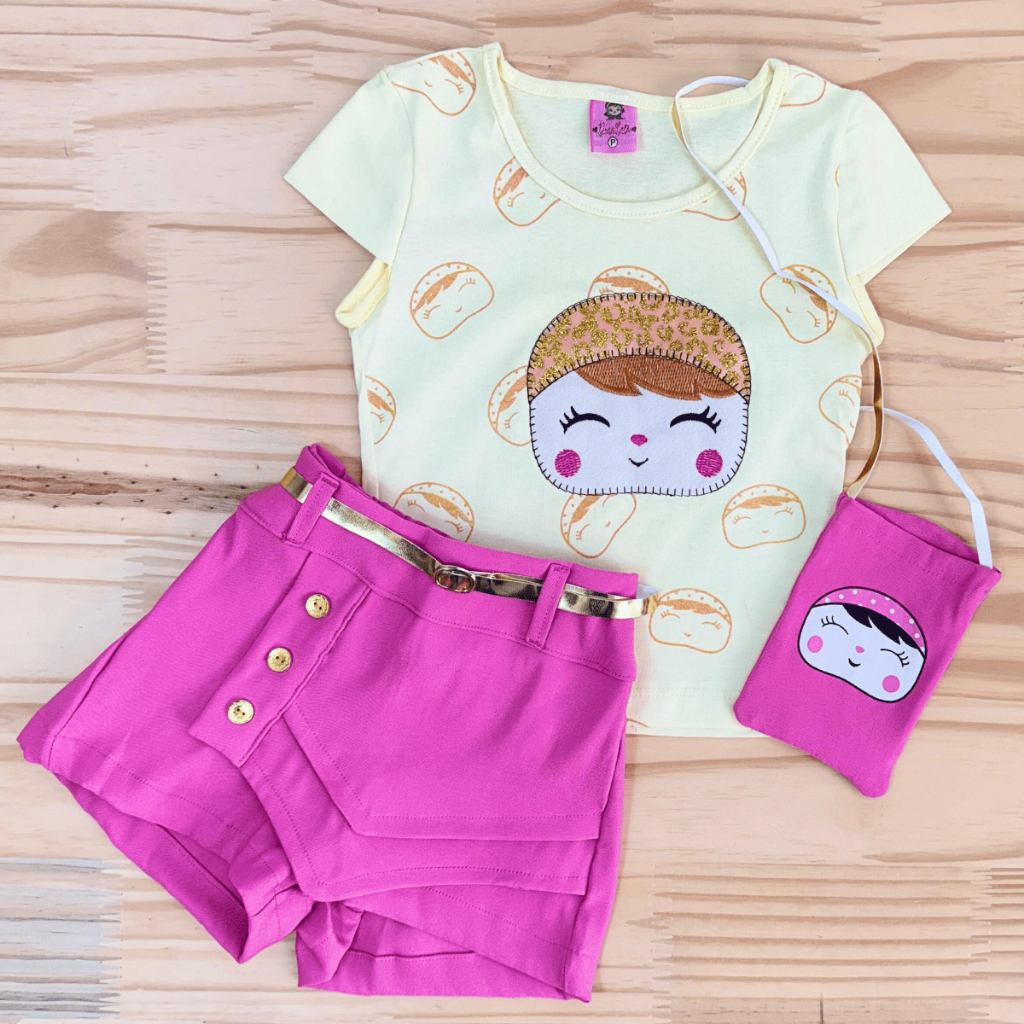 Conjunto Infantil Meninas Camiseta, Shorts Saia e Bolsinha Conjunto Social Blogueirinha Feminino