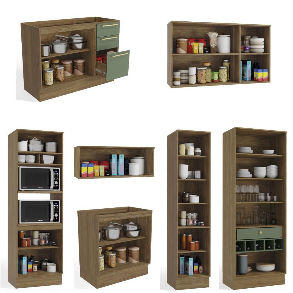 Kit Cozinha Completa Modulada Balcão Para Pia Armário Paneleiro Cristaleira Marrom Madeira Verde