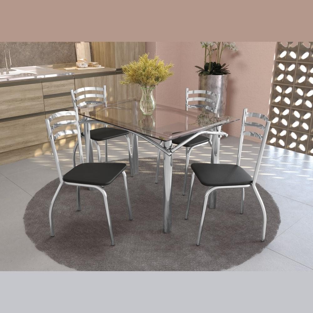 Conjunto Sala de Jantar Kappesberg Crome Tampo de Vidro 4 Cadeiras Cromado Preto