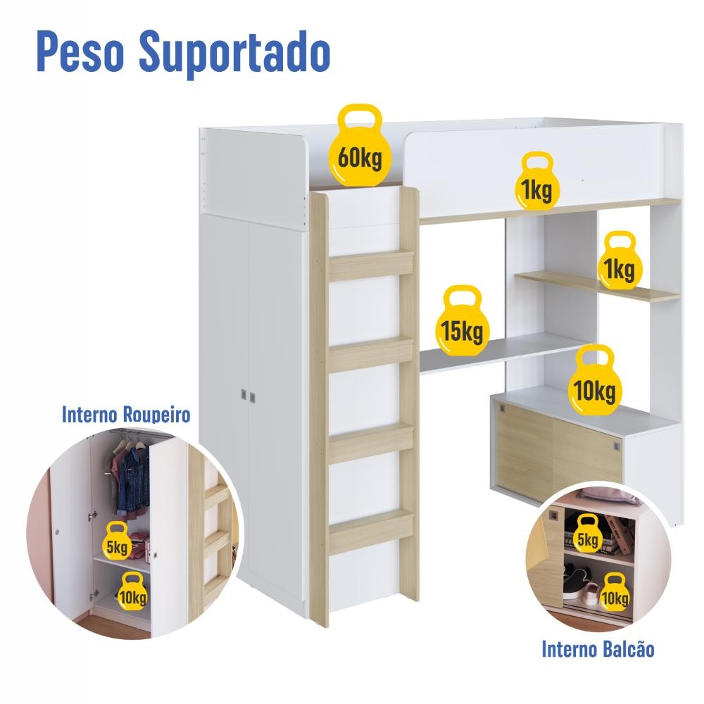 Cama Infantil Multifuncional Elevada com Armário e Escrivaninha Branco/Carvalho - Completa Móveis