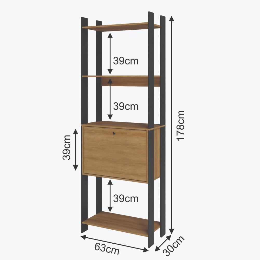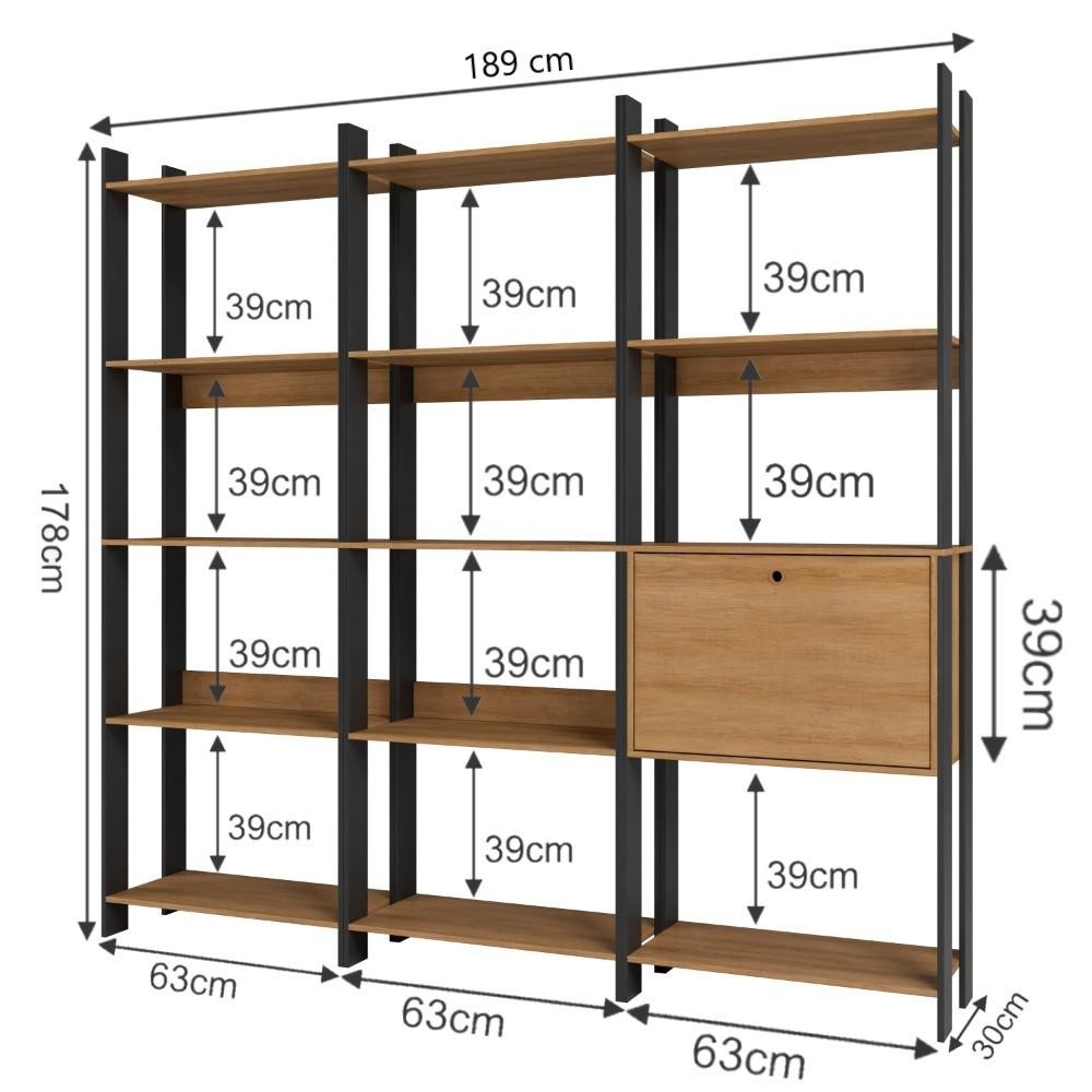 Kit 3 Estantes para Livros 1 Porta 15 Prateleiras Estilo Industrial Lâmina Mel/Preto - BRV Móveis